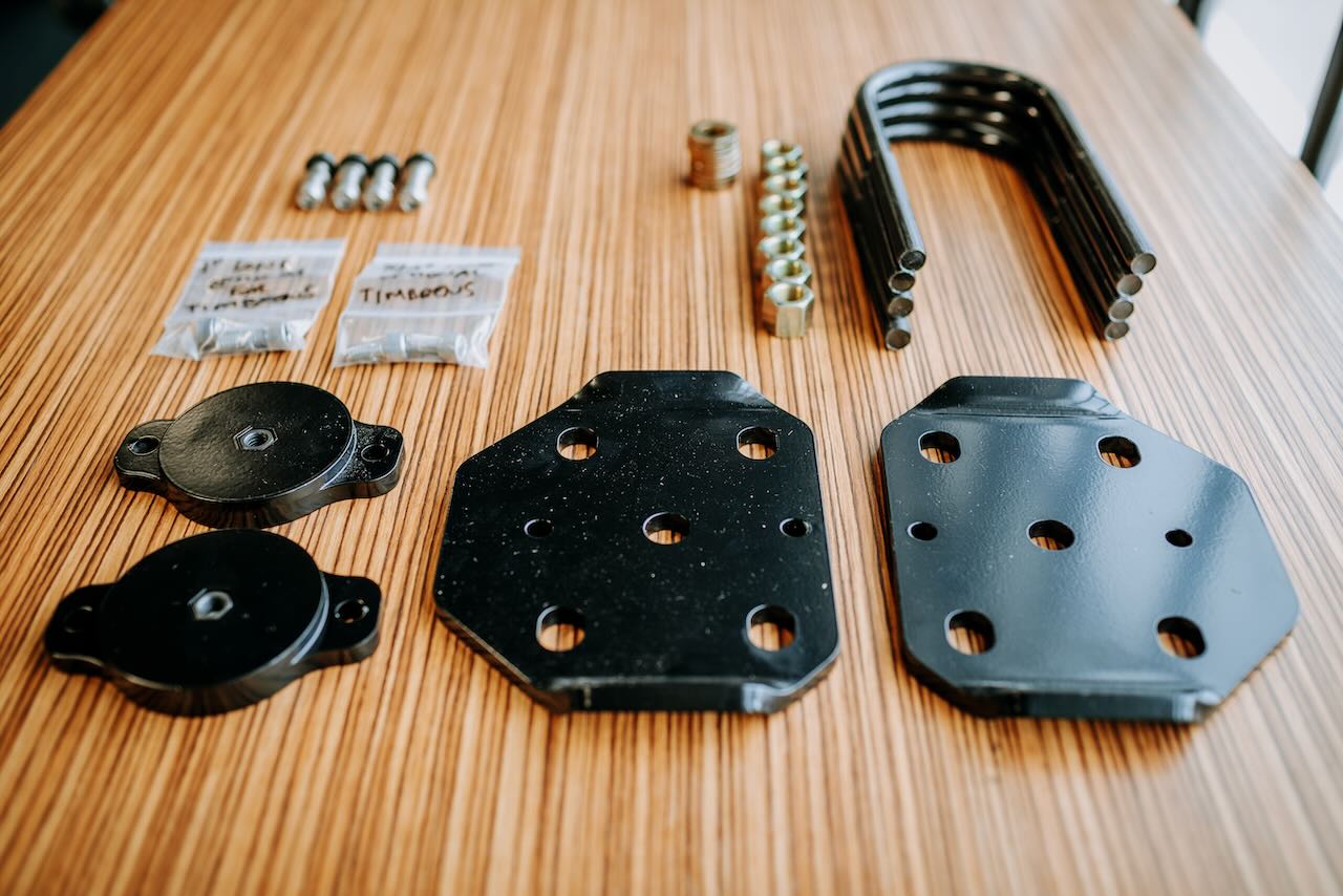 We’re installing the rear SES kit with Timbren’s half-inch spacer kit and an Archive Garage Stealth HD U-bolt flip kit. If we find that the bump stops are contacting too soon (especially when/if the rear springs settle slightly), we’ll remove the spacers as needed in the future to allow for some suspension up travel before contact is made between the Timbren and the frame.
