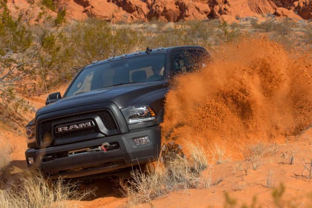 With a history dating back to 1945, the Power Wagon has long been respected as a heavy hauler, solid work truck, and up to just about any task at hand. What most people don’t know, however, is how capable the latest variant is on the trial. After towing an 8,950-pound Jeep/trailer through city streets and over mountain passes, which it did with ease, we pulled into the Moapa OHV area near Valley of Fire State Park. After disconnecting the trailer and offloading its cargo (2016 Jeep Wrangler JK), we aired the Ram’s 33-inch Goodyear DuraTrac tires down to 30 psi and shifted the transfer case lever into four-wheel drive (no push-buttons here). The Moapa area is reminiscent of Moab, Utah, and offers a plethora of terrain options: sand dunes, high-speed two-tracks, and technical rock crawling.
