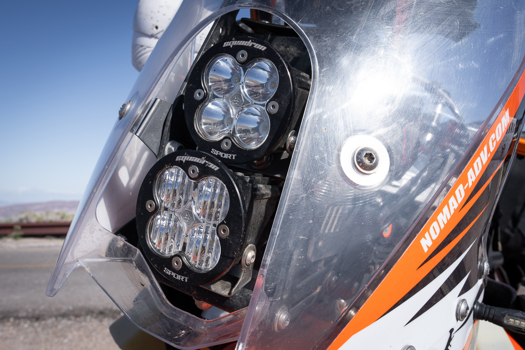 Beyond gassing up, the Nomad-ADV Rally Tower, equipped with Baja Designs headlights, illuminates our path in low-light conditions and provides superb wind protection—an upgrade we appreciate wholeheartedly during long stretches in the saddle while battling the elements.