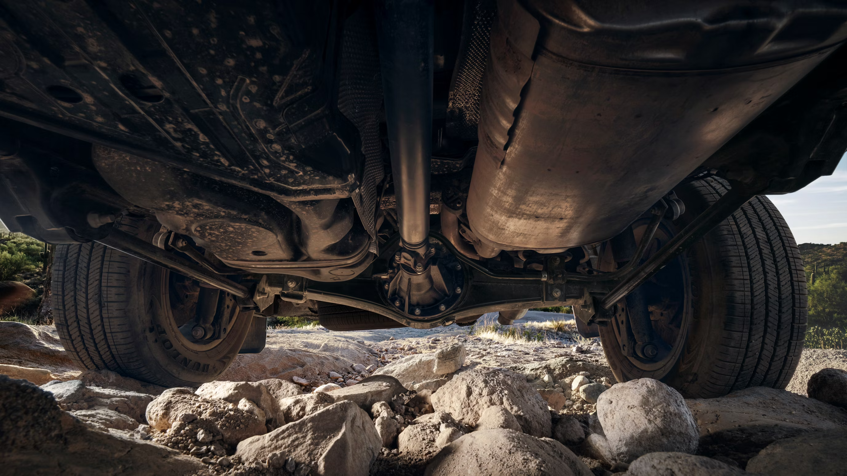 The drivetrain is full-time four-wheel drive across all trims, supported by a two-speed transfer case. Locking center and rear differentials are standard, designed to ensure even power distribution across demanding terrain.