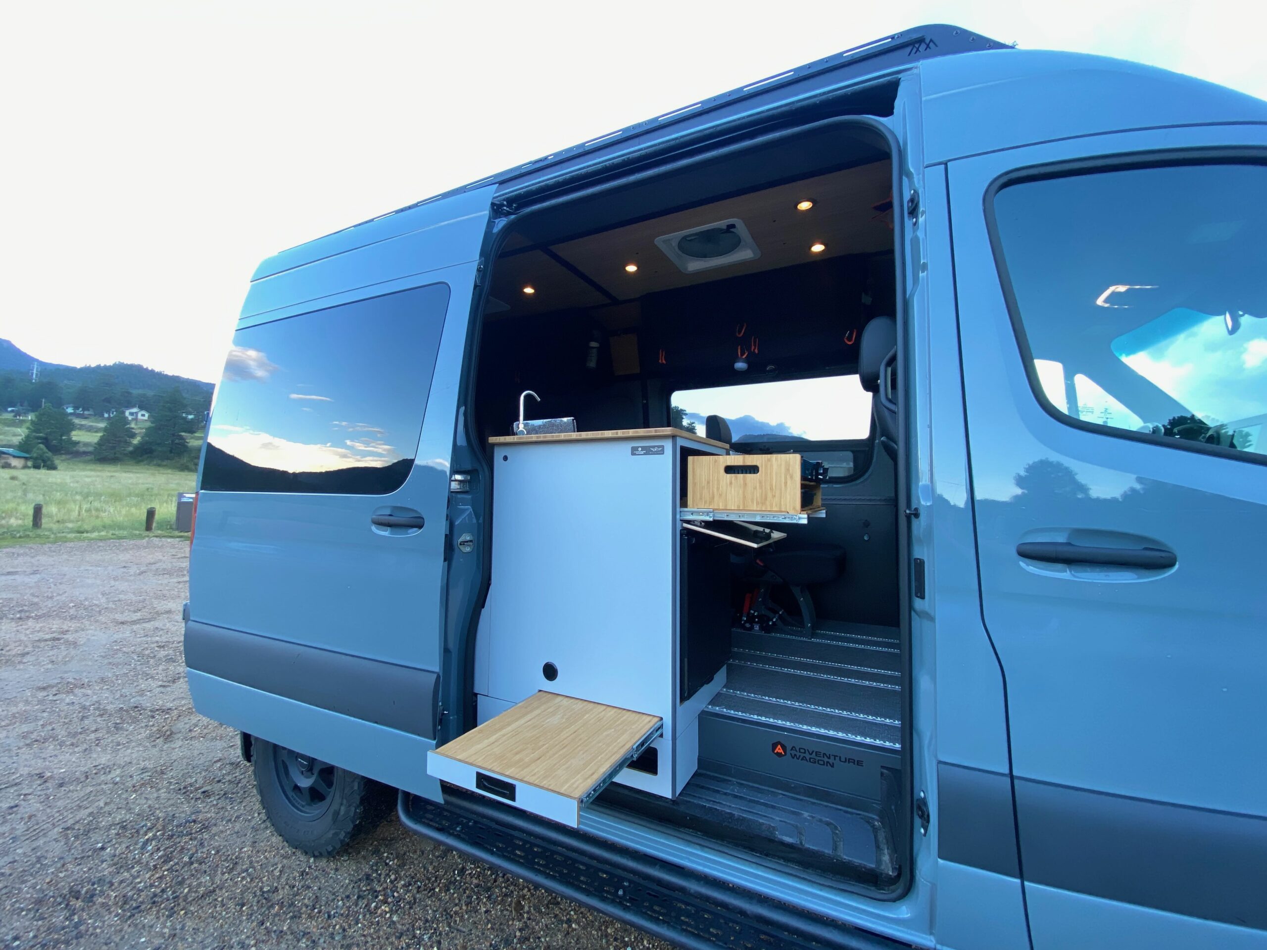 I lived with the Adventure Wagon Sprinter for a week during a Colorado August and used it both to commute about 35 miles back and forth from Estes Park to Loveland during the Mountain West edition of Overland Expo, as well as a couple of short sorties into the mountains. There is something appealing, I will admit, about lifting an armrest and sliding from the driver’s seat straight into the van’s expansive, standing-room living space without a thought. This particular Mercedes featured Adventure Wagon’s (extremely comfortable) Moab bed, their Mule Bag storage system, a second-row removable passenger seat, a sliding storage drawer, and a prototype kitchenette.