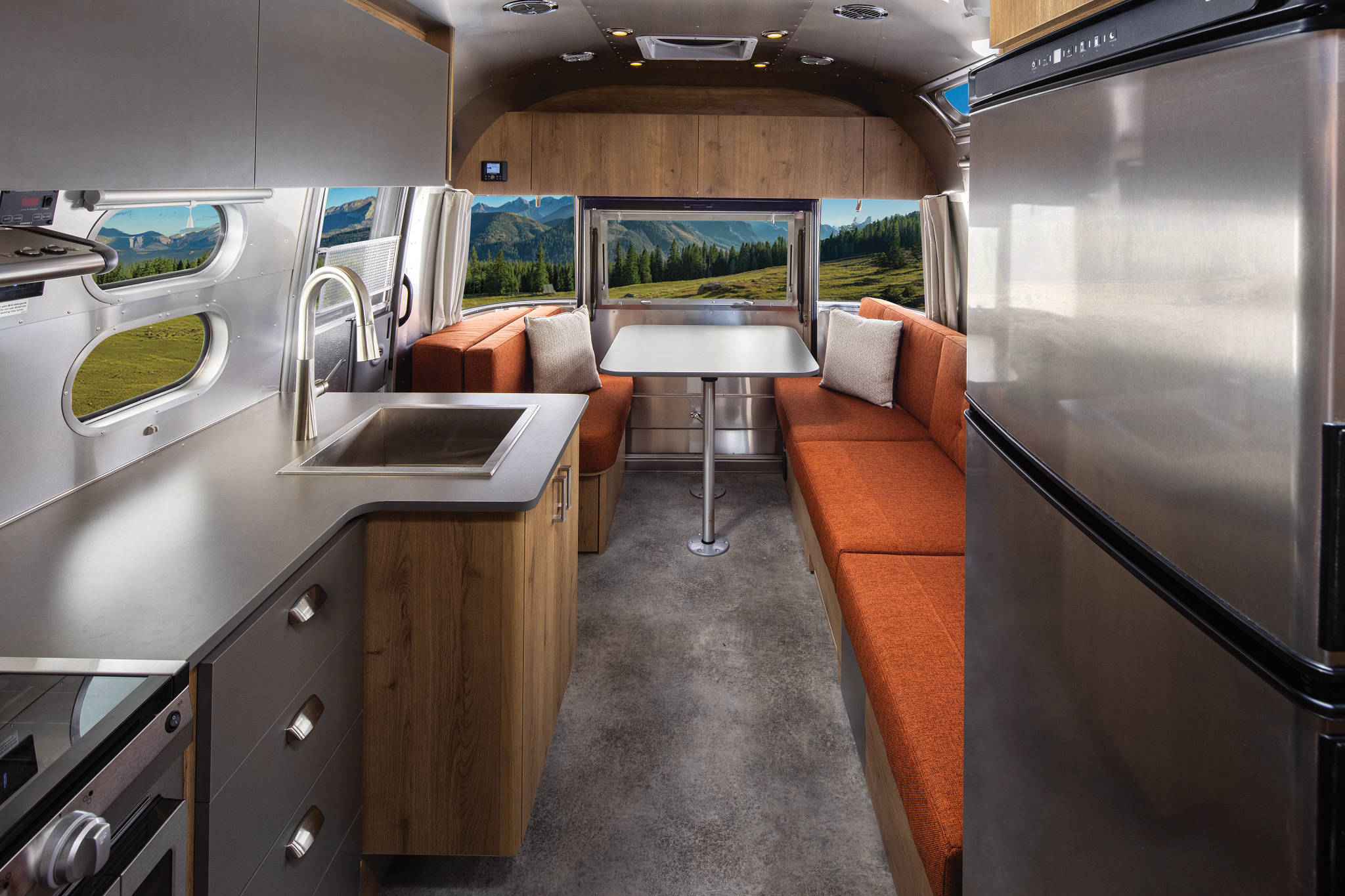 The interior launches with Airstream’s Amber Ridge décor, a warm, refined palette intended for extended journeys. Technology features include a new Garmin multiplex control system, a JBL Bluetooth stereo, and a 24-inch 12-volt Smart HDTV mounted on an articulating arm in the bedroom.