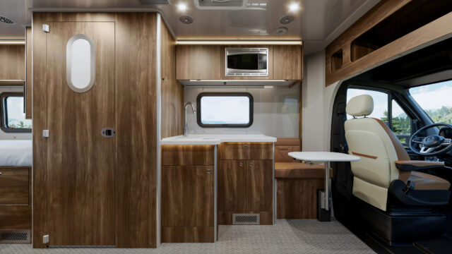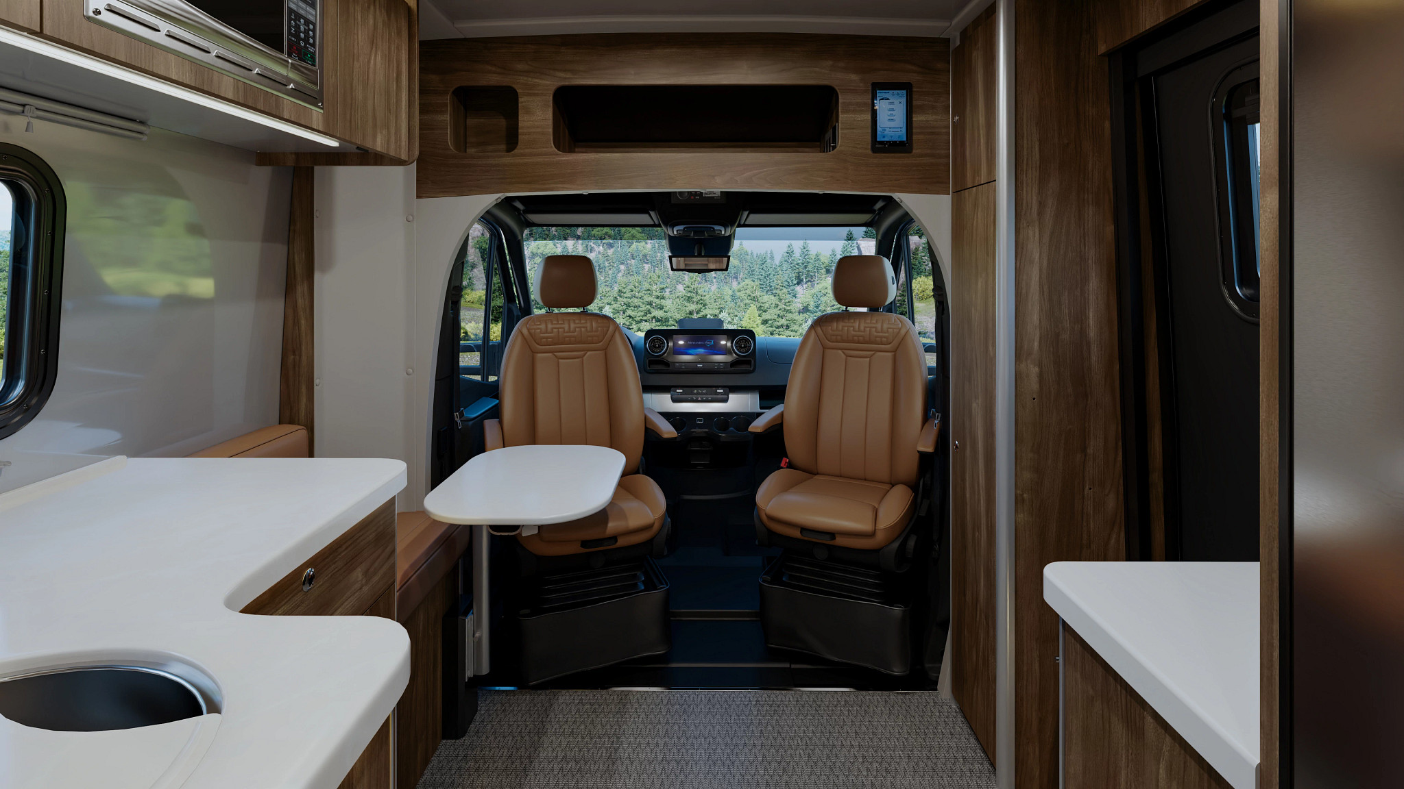 Built on the Mercedes-Benz Sprinter 4500 cab chassis, the Atlas 25RT is constructed in-house with custom walls and a redesigned roof that expands the interior beyond the limitations of a standard Class B van shell. Power comes from a 2.0-liter high-output turbo-diesel engine, complemented by Mercedes-Benz Trailer Stability Assist. Standard electrical equipment includes a 6.9 kilowatt-hour lithium battery bank and a 3,000-watt inverter, with an optional upgrade to Airstream’s 17.2 kilowatt-hour Advanced Power Plus System.
