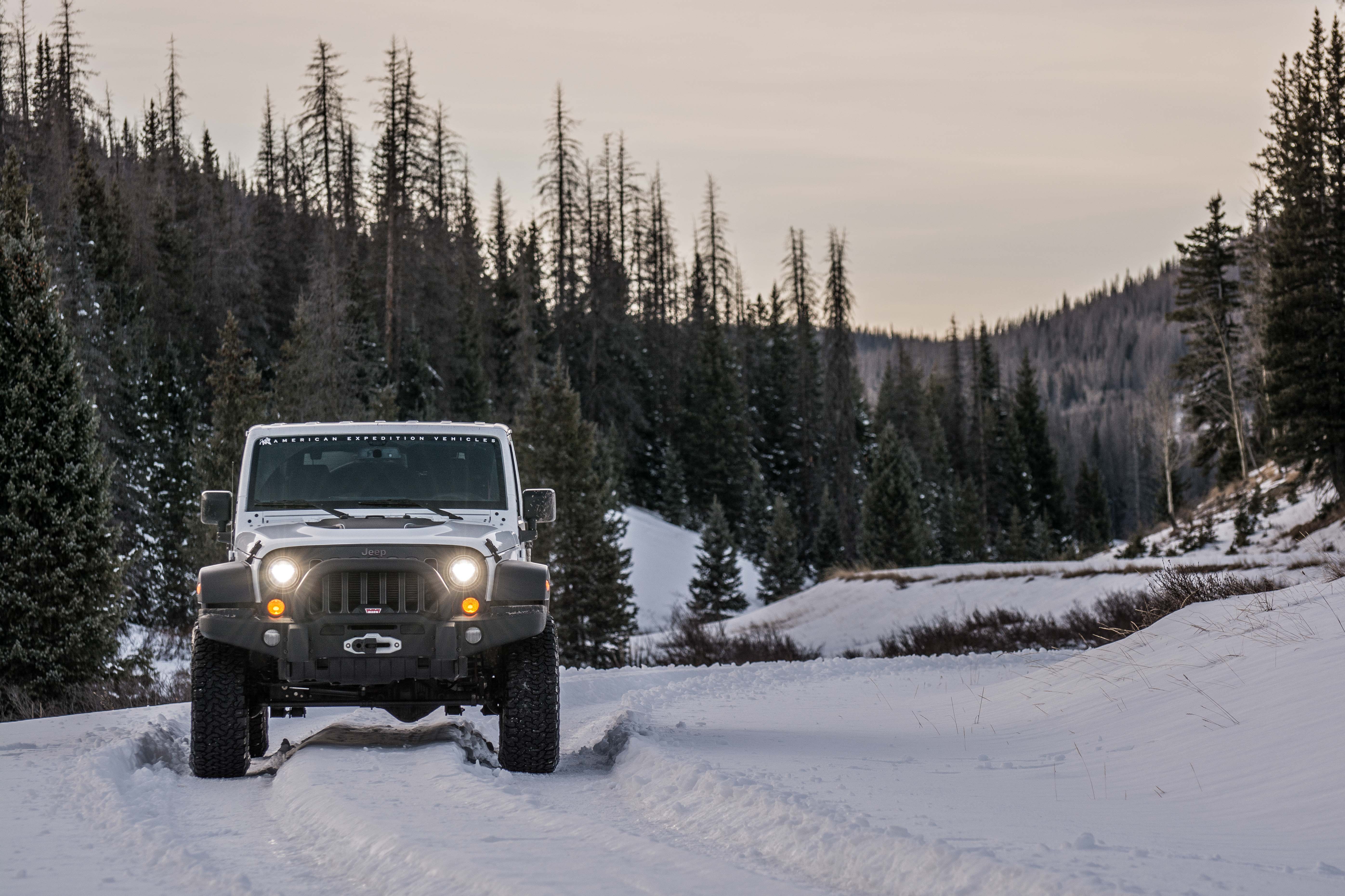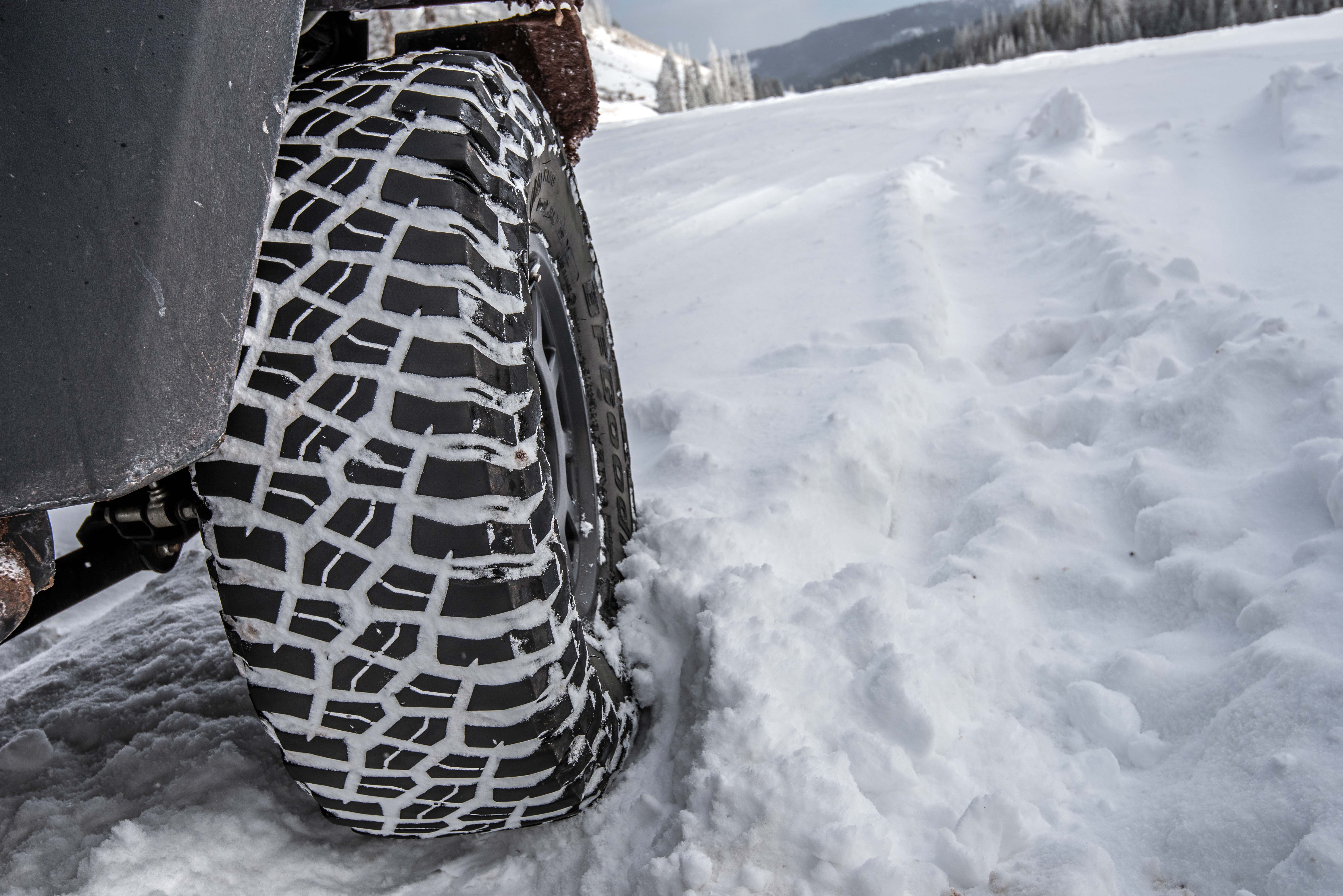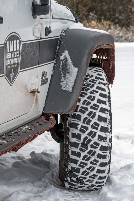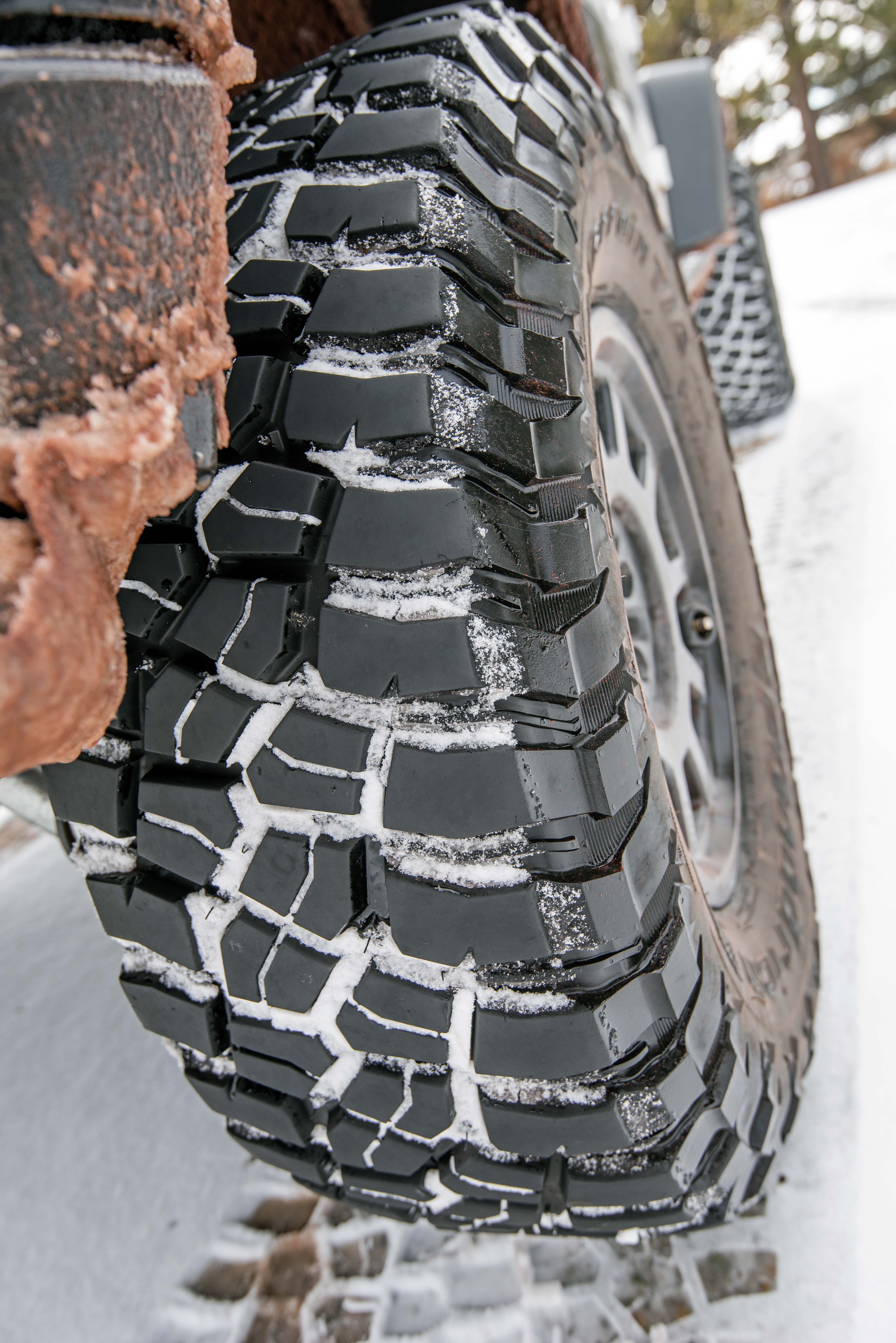 Backroads and Trails Winter Performance Off the beaten path, in snow ranging from a few inches to nearly 2 feet, the BFGoodrich KM3 mud terrain produces positive grip that’s as good or better than any other tire I’ve previously run during the winter season. Depending on snow depth and composition, the preferred snow air pressure range for the NMBR Rubicon is 7 psi to 14 psi. If you hadn’t noticed, my approach to maximizing tire performance begins with adjusting air pressure to best suit surface conditions. Following the lead of the KM3’s grip and release mud characteristics, the tire’s tread layout provides above average traction in snow. The KM3’s Mud-Phobic tread design elements help to release packed snow from between treads. The KM3’s main, shoulder, and sidewall patterns maximize snowy surface engagement within the tire’s contact patch, resulting in favorable traction and steering performance. In powdery to medium density snow, I had no issues charging through 2- and 3-foot-deep drifts propelled by the KM3’s aggressive tread pattern. Despite the challenging surface and substrate conditions provided by snow through technical terrain, the KM3 held a relatively firm grip on off-camber, steep ascent/descent, and technical trail sections. In the deepest and densest snow, the NMBR Rubicon’s front bumper, axles, and undercarriage did more to inhibit forward motion than the tire’s limitations. Comparing the KM3 and KM2, the two tires perform similarly in snow. However, the KM3 does do a better job releasing snow from the tread pattern. While the KO2 all terrain outperforms the KM3 mud terrain for most on-road winter driving conditions, the KM3 takes the lead as snow depth increases. The main tread pattern of the KM3 is less likely to become overwhelmed by snow than the KO2 for the same “grip and release” characteristics mentioned within the mud performance comparison. On a side note, being light on the throttle and maintaining controlled forward motion helps prevent an aggressive tire tread pattern from digging down into snow or other unstable surface types and consequently burying the vehicle.