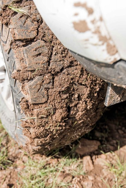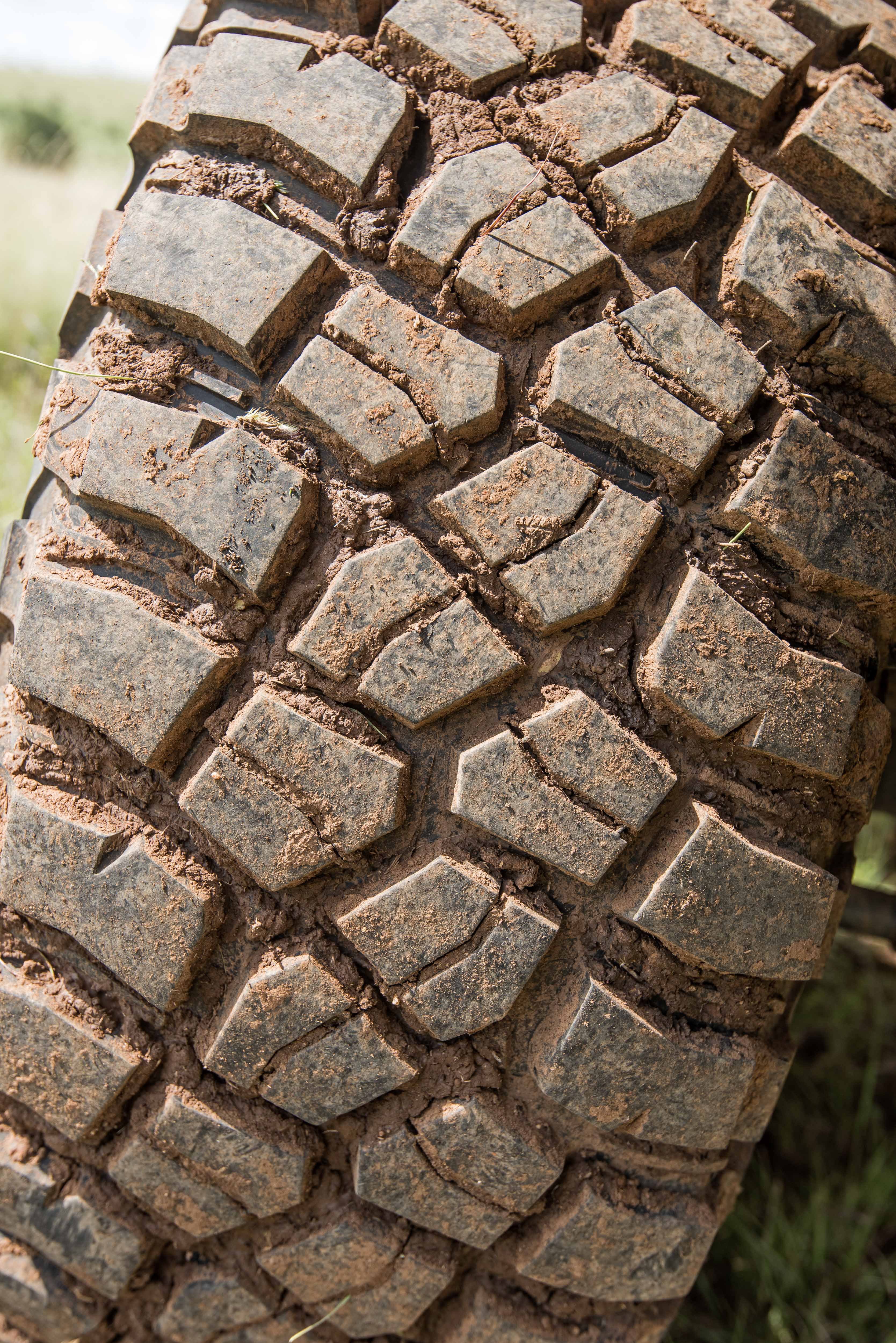 The KM3’s first significant mud challenge came during NMBR’s 375-mile Gila Legends Expedition. The overland traversal unfolds during the height of the Southwest’s summer monsoon when heavy downpours often render treacherous trail conditions along the route. This year’s Gila Legends Expedition provided mile after mile of water-logged terrain from deep-tracked clay to slick vermillion to burn scar ash slurry. The performance characteristics of a mud-terrain tire (in mud) can be separated into two categories: grip and release. Let’s dig deeper into these harmonious functions as they relate to a tire performance in mud. For grip, the tire’s main tread pattern must feature tall and widely spaced lugs that support maximum surface contact (creating friction) in order to engage liquefied terrain. Vehicle traction on any surface relates the amount of engine torque being transferred from the engine to the tires to the ground, and the subsequent vehicle movement that does or doesn’t result. Ideal traction occurs when a tire has the ability to hold ground (or create friction) without spinout or sliding during vehicle motion. Under the best circumstances, the tire’s diameter multiplied by the number of tire revolutions (for any given stretch of terrain) should be nearly identical to the distance of ground covered. Because mud is enveloping, a heavily lugged sidewall tread pattern is necessary to capitalize on the tire’s increased contact patch under such conditions. The main and sidewall tread pattern of the KM3 provides considerable friction and forward in the slickest mud. On the subject of release, a well-performing mud-terrain tire via angular kinetic energy (or rotation), will self-clear a significant amount of mud and debris from between tread voids. If a tire’s tread pattern and functionality are lost behind a blanket of mud, it’s no better than a racing slick in the jungle. The BFGoodrich KM3 provides a strong combination of both grip and release traits that allow the tire to excel through a variety of muddy and soft surface conditions. The KM3’s trademark Terrain-Attack tread pattern, featuring deep voids and dominant blocks, yield strong traction performance in mud that usually necessitates the use of a winch and recovery gear. To help support the release of mud and debris packed within the main tread pattern, BFGoodrich positioned raised Mud-Phobic bars and pyramids between tread blocks.