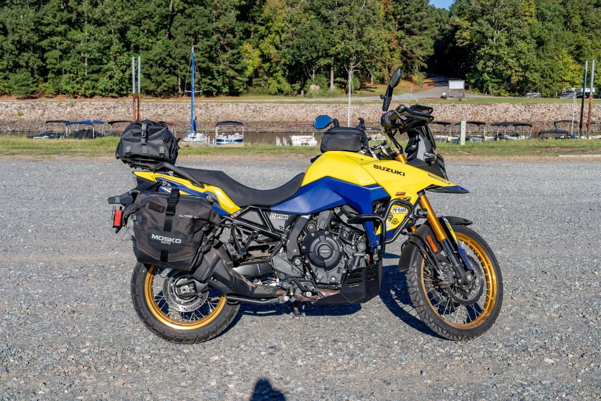The Ultimate Overland Motorcycle Build for 2025 is a Suzuki V-Strom 800DE, chosen for its balance of versatility, reliability, and off-road agility. Powered by a 776cc parallel-twin engine and equipped with long-travel suspension and spoked wheels (21-inch front, 17-inch rear), the V-Strom is equally at home on winding highways or remote backroads. Inspired by Suzuki’s Dakar rally heritage, the bike’s setup emphasizes rugged functionality in bright blue and yellow livery.
