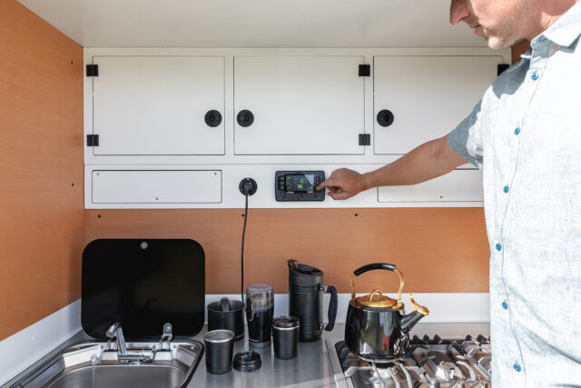 Inside the insulated cabin, campers will find a comfortable queen-size memory-foam mattress, a Propex forced-air furnace for cold-weather trips, and HDPE cabinetry. Although the bed is 6.5 feet long, the overhanging cabinetry may limit foot flexibility. At the rear, the galley, which extends over the kitchen area and acts as an overhead canopy, opens to reveal a stainless-steel kitchen slide with a 20,000 BTU Partner Steel cookstove, a sink with on-demand hot water, and a 60-liter Truma fridge/freezer. With 30 gallons of onboard water, a lithium battery system, a Victron charge controller, and a 100-watt solar panel, the XT is entirely self-sufficient for extended stays off the grid.