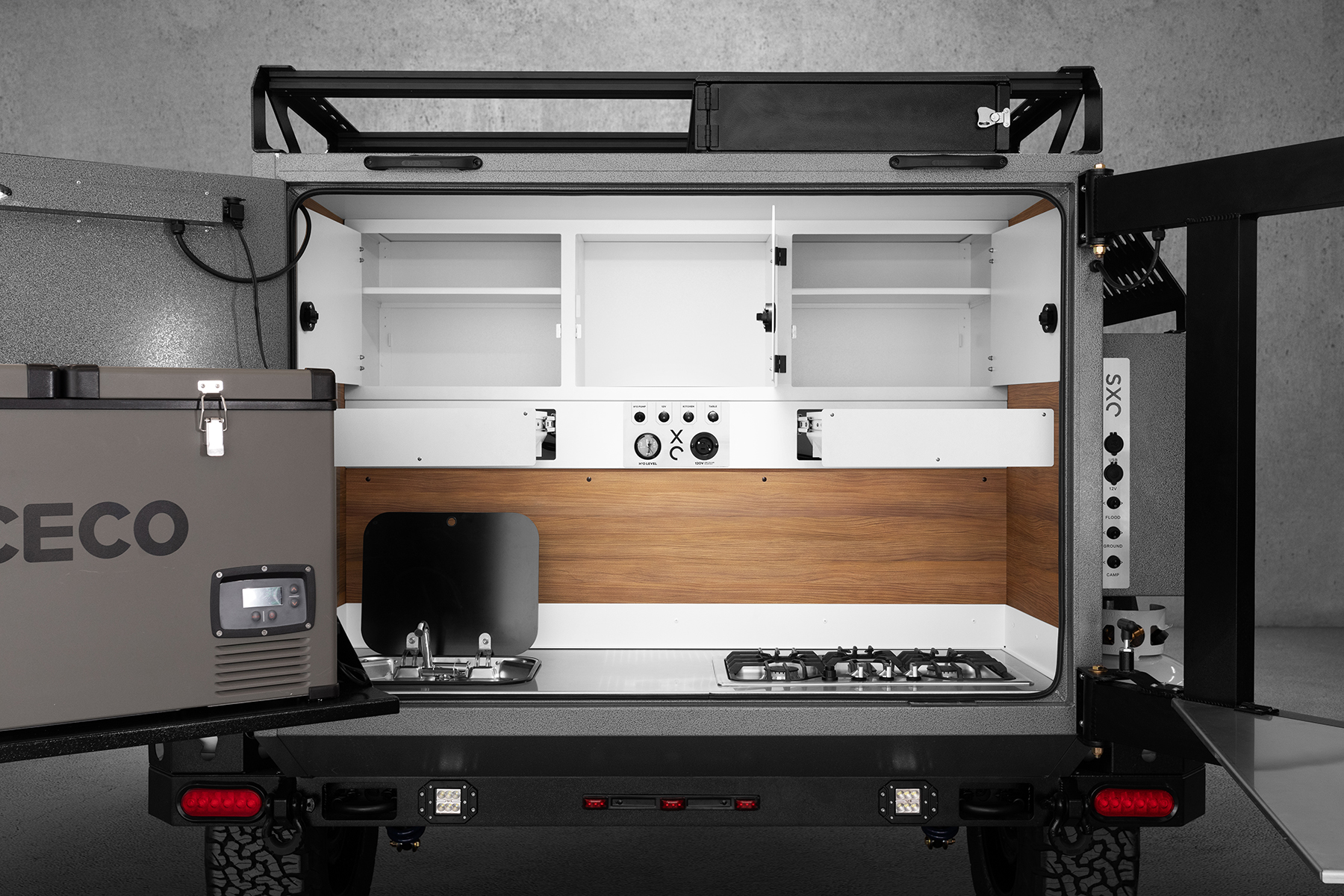 At the rear, a pull-out camp kitchen is accessible through the back hatch. It includes a freestanding two-burner stove, storage cubbies, a collapsible wash bucket, and a recessed area for a 5-gallon water can, mounted just above.