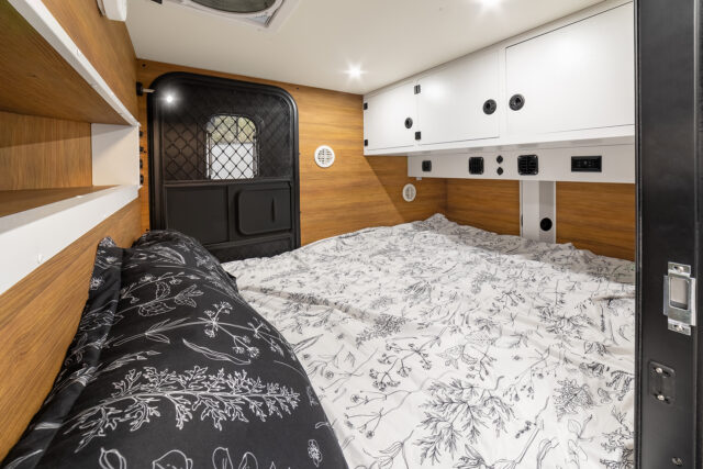 Inside the HQ, the cabin features two windows for natural light and ventilation, a spacious queen-size memory foam mattress, and cleverly integrated storage that keeps gear organized without crowding your personal space.