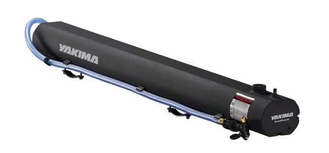 The Yakima RoadShower can easily be attached to the roof rack of your sedan, SUV, or trailer via stainless steel universal mountings and Same Key System (SKS) locks for added security. This 55-inch-long welded aluminum tube is solid and durable. Although aluminum does not rust, it does corrode; the powder-coat finish of the Yakima RoadShower will ensure that this water container will stand the test of time. When filling, a water inlet on either side of the tube can be used but needs to be pressurized; this can be achieved by using your garden hose, a hand, or an electric pump. A built-in pressure valve ensures that the tube is not pressurized past the 55 psi mark.