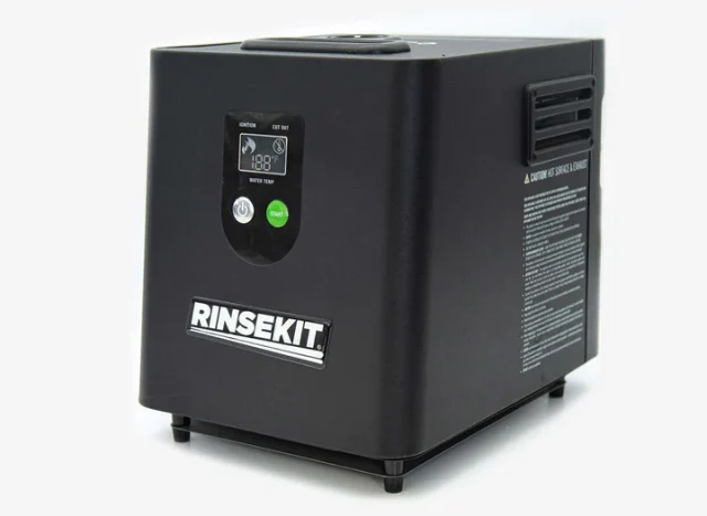 Alternatively, the RinseKit HyperHeater, which is propane powered, can be paired with your RinseKit Pro or Pro Pak. The latter option, unfortunately, equates to a lot more equipment but can heat your water to 110°F in less than 30 seconds.
