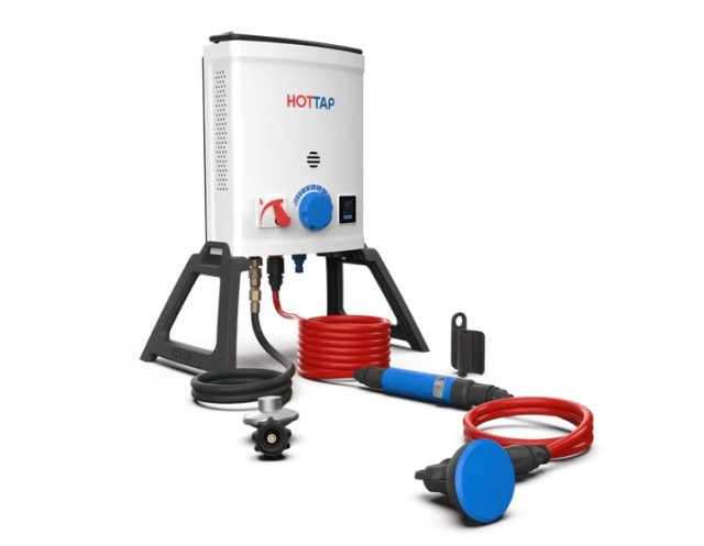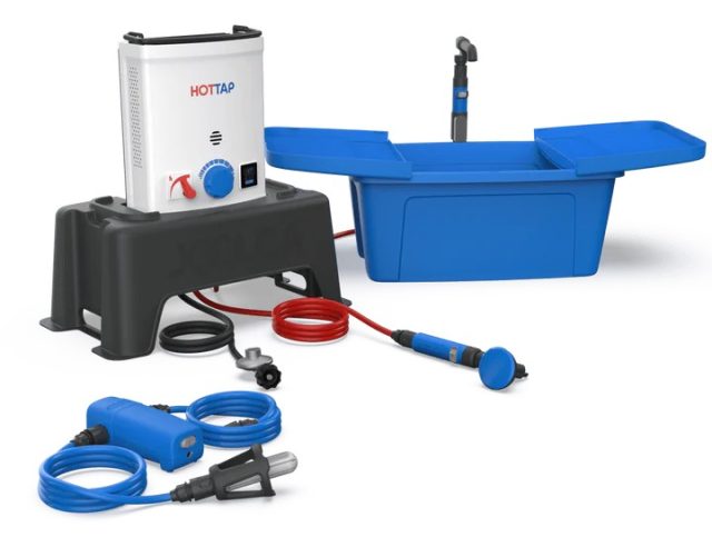 The Hottap water unit measures 17.7 (h) x 11.4 (w) x 6.6 inches deep, and the pilot light is ignited by two D-cell batteries that should last approximately three to six months. The Hottap temperature reaches 125°F with an automatic limiter and an adjustable flow rate of between half a gallon to 1.5 gallons per minute. If purchasing the Essentials kit, bear in mind that you would need to source a pressurized water source, as the Hottap does not have a built-in pump.
