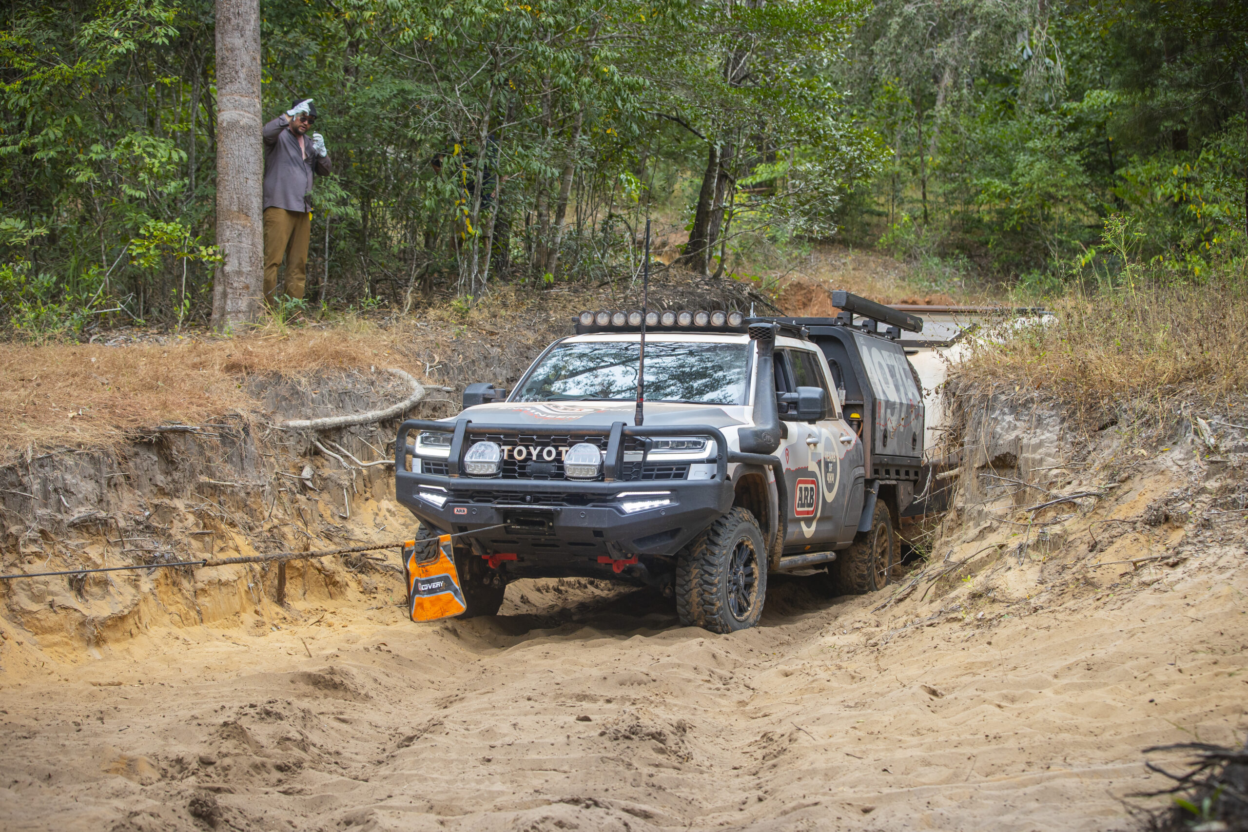 With some trepidation, we continued forward, dropping into one water hole, creek, or bog after another, but we were making progress. The water crossing at Palm Creek was our next challenge, with spotters wading into the crocodile-infested waters to find the deep holes, sand traps, and hidden rocks. The drivers dropped in one by one, heeding the precise instructions as water surged over the hoods, followed by a steep exit climb on wet tires. Locking the rear axle of my HiLux, the truck clambered up the shelf, even dragging the skid plate briefly on the deep ruts.