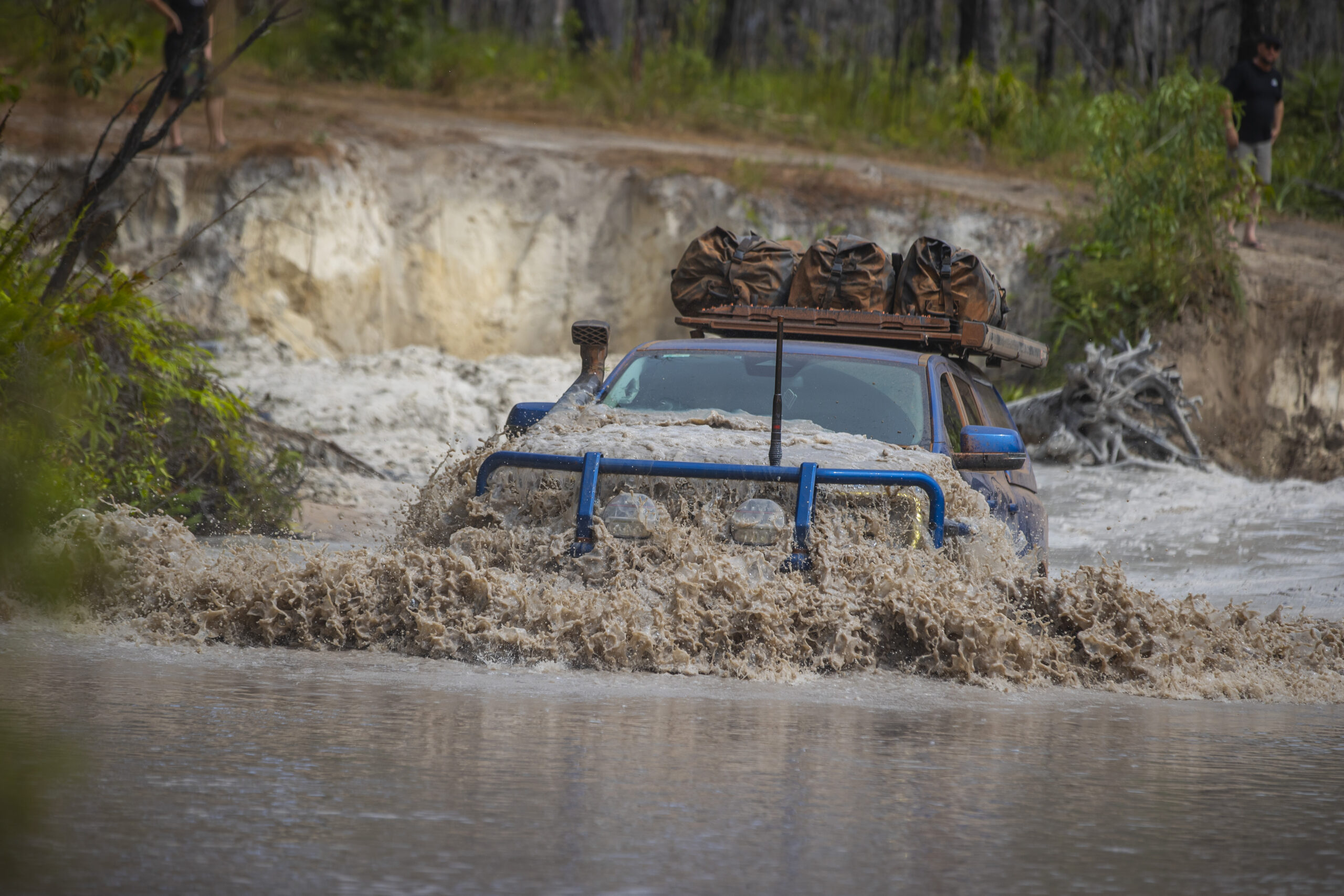 Last to cross was Steve with the Jeep Wrangler—the lowest in the group and the only one with a petrol motor. He is a good driver and has a lot of experience with the track, but the vehicle was the most likely to float or hydrolock. Immediately upon entering the hole, the Jeep leveled out and started to float, slowly drifting downstream. Steve kept the tires turning, but there was no grip, and even though the Jeep was slowly sinking, it wasn’t fast enough to let the tires hook up. In a stroke of genius, Lachlan (one of the spotters in the water) grabbed the front bull bar and pulled the Jeep toward the sandbar by hand. Like a boat pulled to the dock, the Jeep slowly progressed and exited the hole. It was a small miracle that it didn’t hydrolock, but the entire body tub was filled with water.