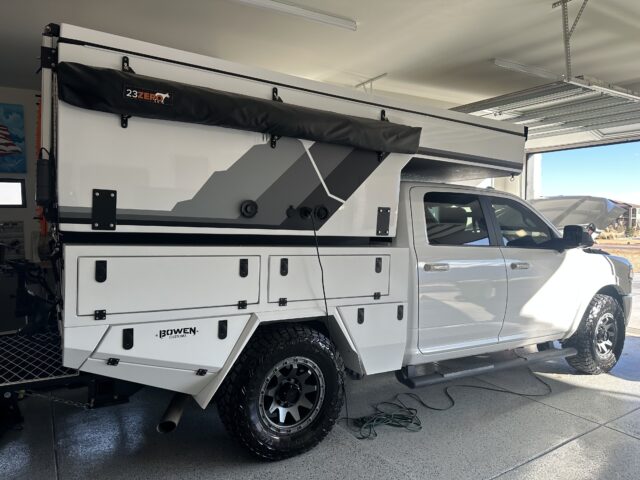 “As an avid enduro rider and photographer, I’ve relied on a Sprinter van for many years. However, one major hurdle persisted: my garage. The constant struggle of not being able to store the van indoors due to my 9-foot garage door became a significant frustration. Initially, I considered a pop-top van as the only solution. However, when I discovered the Supertramp camper, I was immediately captivated. Already a fan of my Ram 2500’s ride and performance, I knew it could serve as the perfect base for the Supertramp. However, two challenges remained. The stock ride height of the Supertramp camper installed on the Ram 2500 measured 110 inches, while my actual garage door opening was 109 inches (less than 9 feet). This necessitated the installation of Kelderman Air Suspension, allowing me, at the push of a button, to drop the truck’s suspension to fit within my 109-inch height limitation. The added benefit was being able to easily level the rig at campsites by independently adjusting each airbag. Storage remained the final concern. The Bowen truck bed offered the solution, providing ample capacity without sacrificing the truck’s agility. A year later, my creation surpassed expectations, outperforming the van on all fronts.”