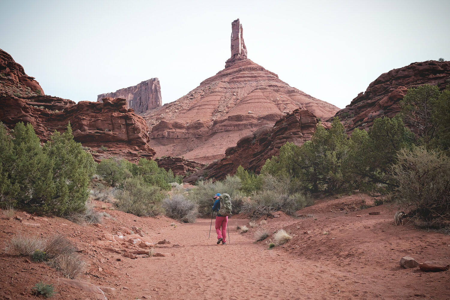 Hiking to Castleton Tower with heavy packs full of climbing gear.