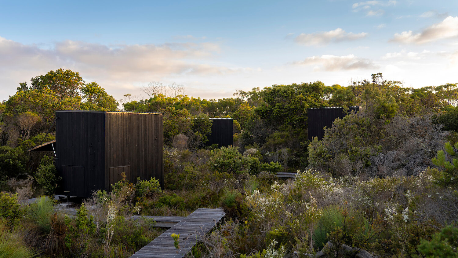 This journey departs from Stumpy’s Bay in wukalina/Mount William National Park and covers 11 kilometers before arriving at krakani lumi, a backcountry camp where travelers will spend the evening. The accommodations, which blend harmoniously with the surrounding banksia marginata (aka silver banksia shrubs) and sand dunes were commissioned by the Aboriginal Land Counsel and designed by Taylor and Hinds architects. These domed sleeping pavilions provide shelter as well as a community gathering place for foot-travelers and each building is interconnected by a series of narrow wooden walkways that are elevated above the sand and surrounding vegetation.