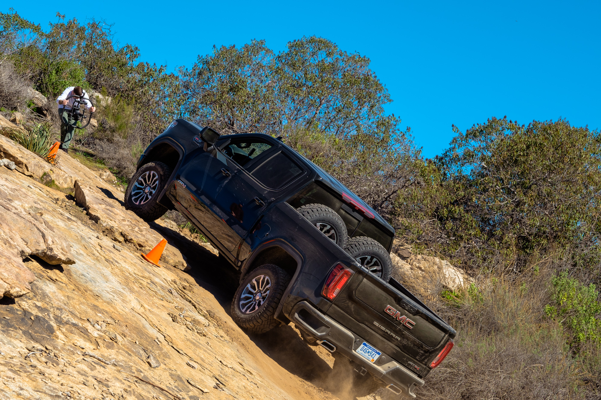 What wasn’t even slightly gimmicky though were the cameras. When working through the rocks or cresting a ledge where the hood blocked the trail ahead, the AT4’s Surround Vision system gave us a clear, unobstructed view of everything before us. Not only that, its guidance lines provided a preview of where the vehicle would go based on the current steering inputs, allowing us to self-spot our way through the course. I cannot overstate how helpful this was in the test, or how useful it would be while traveling solo.