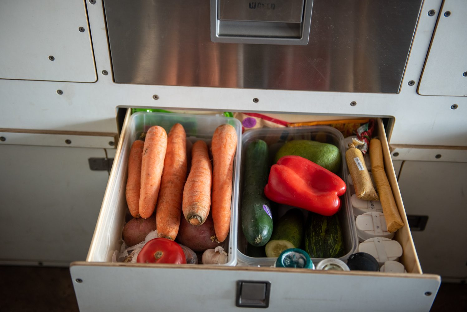 When you are on the road for so long, you need space for food. For refrigerated [items], we opted for a built-in compressor refrigerator drawer from Dometic Waeco. Although it is energetically somewhat less favorable than a box, it is very space-saving, and we are super happy with it. In the drawer below, vegetables and spices are stored. Since that is not enough, we have additional storage for cans, etc., in one of our seat boxes by the door. We have divided the box and stowed things underneath that we rarely need. Everything else, [including] large items, bottles, and drinks, [go] in the small corner cabinet under the kitchen drawer. Even though we have a lot of space for food, when we head out for more than a week, we have to store some of the fresh vegetables and fruits in an additional bag.