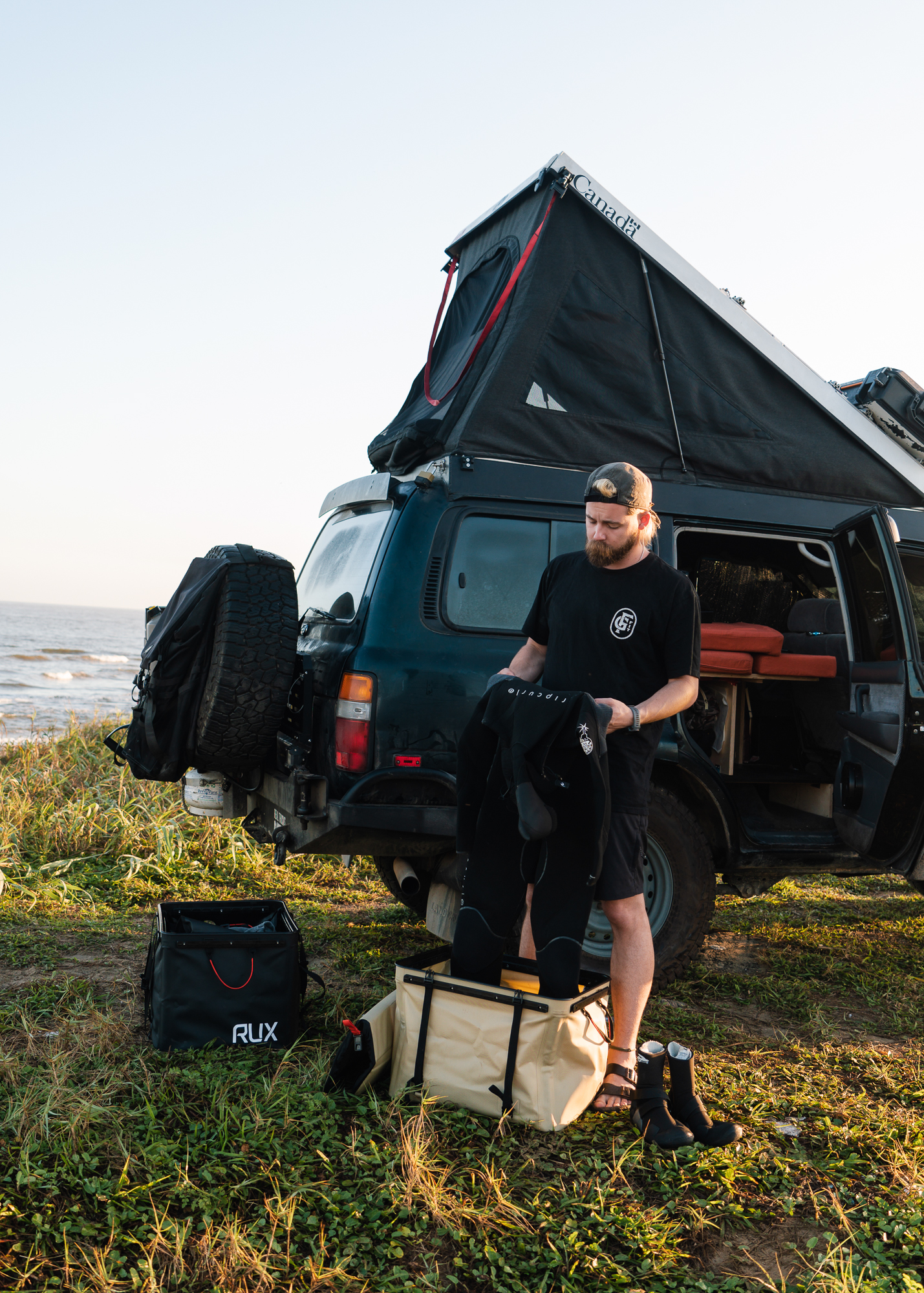“Our main interests are hiking, surfing, and photography, but that gear can be a little bulky for a small space like our truck, so we had to get creative. Our wetsuits are stashed in a 70-litre Rux that sits snugly under our surfboard, which is also strapped to the roof rails.
