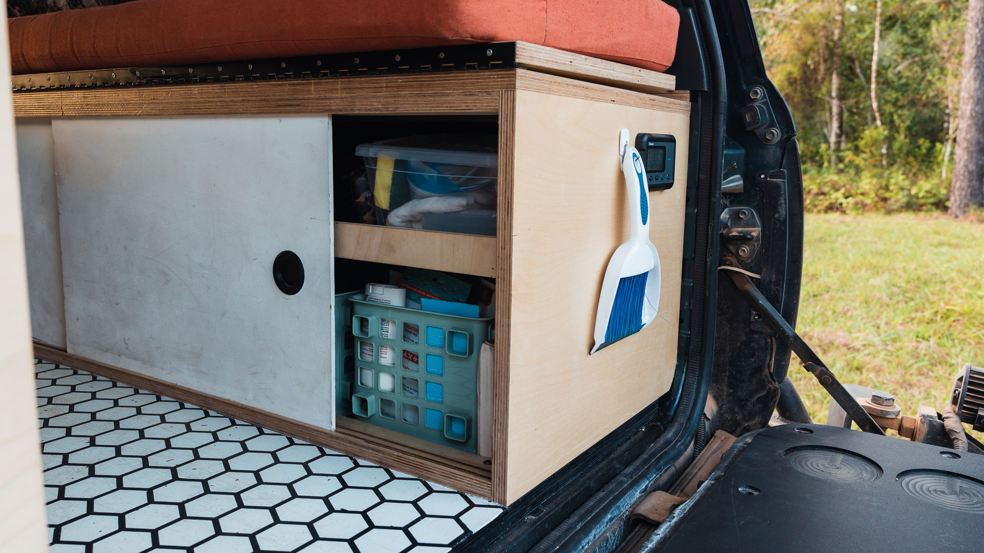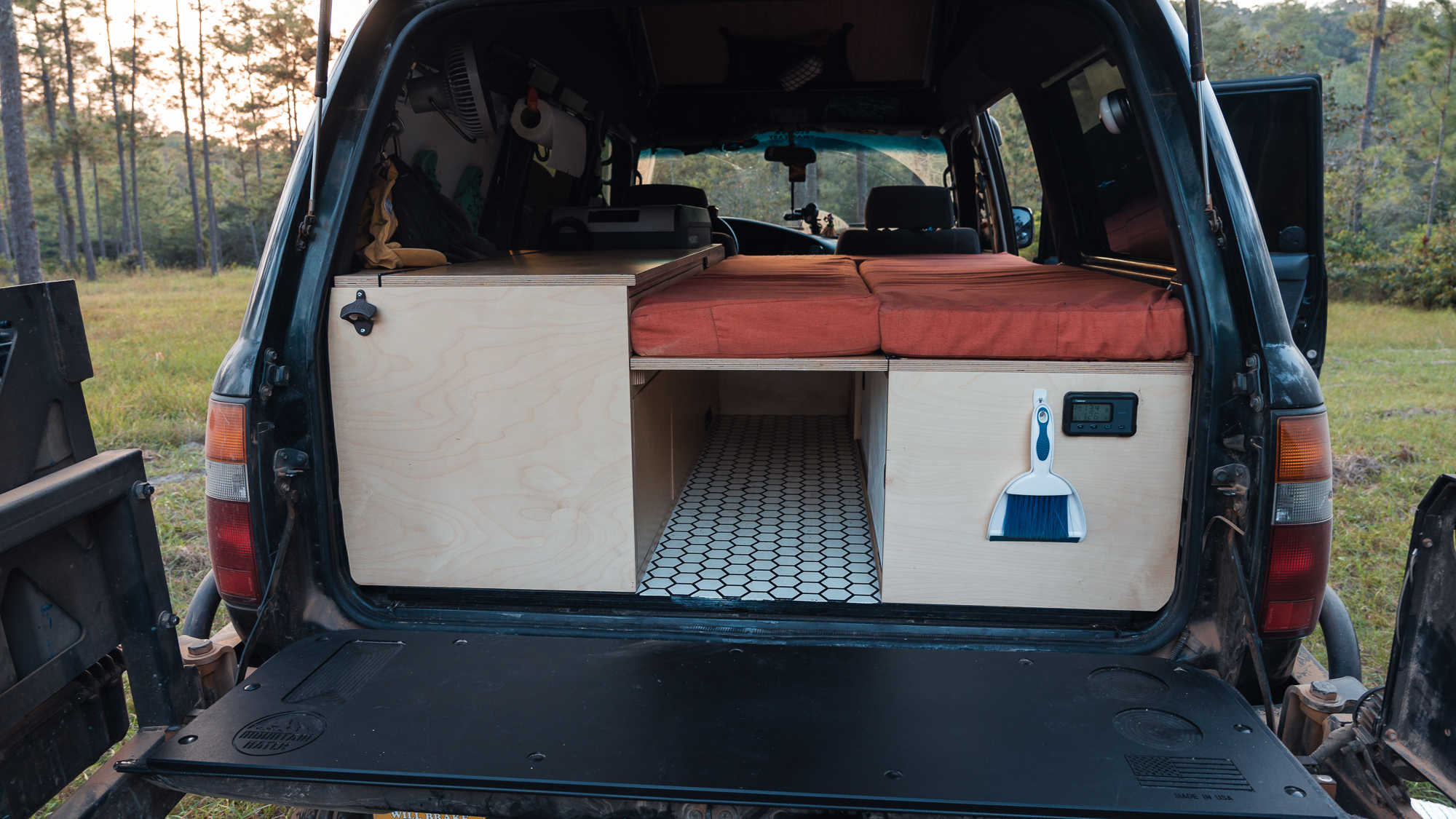 When it’s time to wash dishes, we use a collapsible sink that we store in the top flap of our Trasheroo. This setup works for us as it allows the use of the interior space while food is being cooked off the back kitchen setup. We use the Trasheroo, [which is] attached to the spare tire, to store garbage.