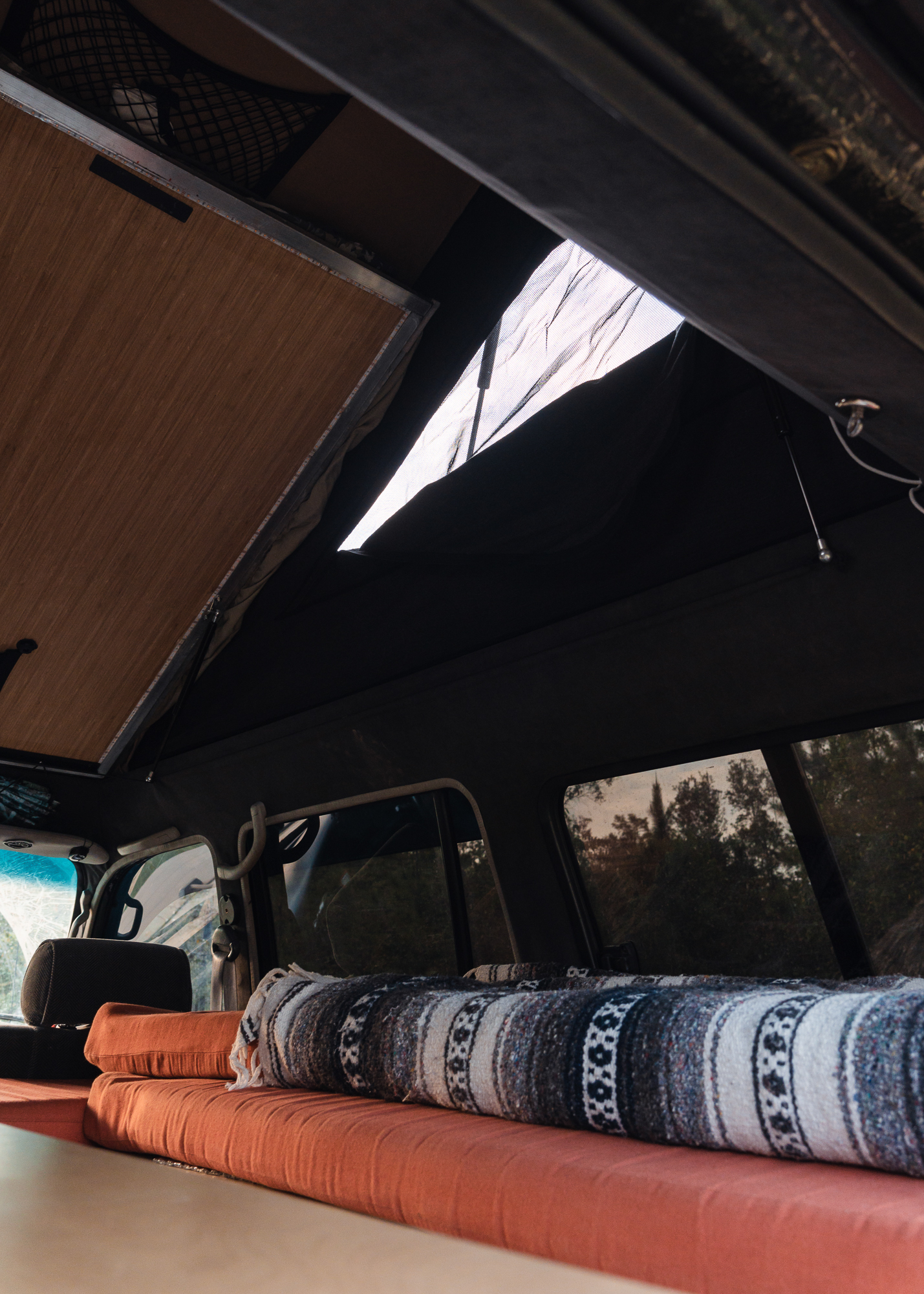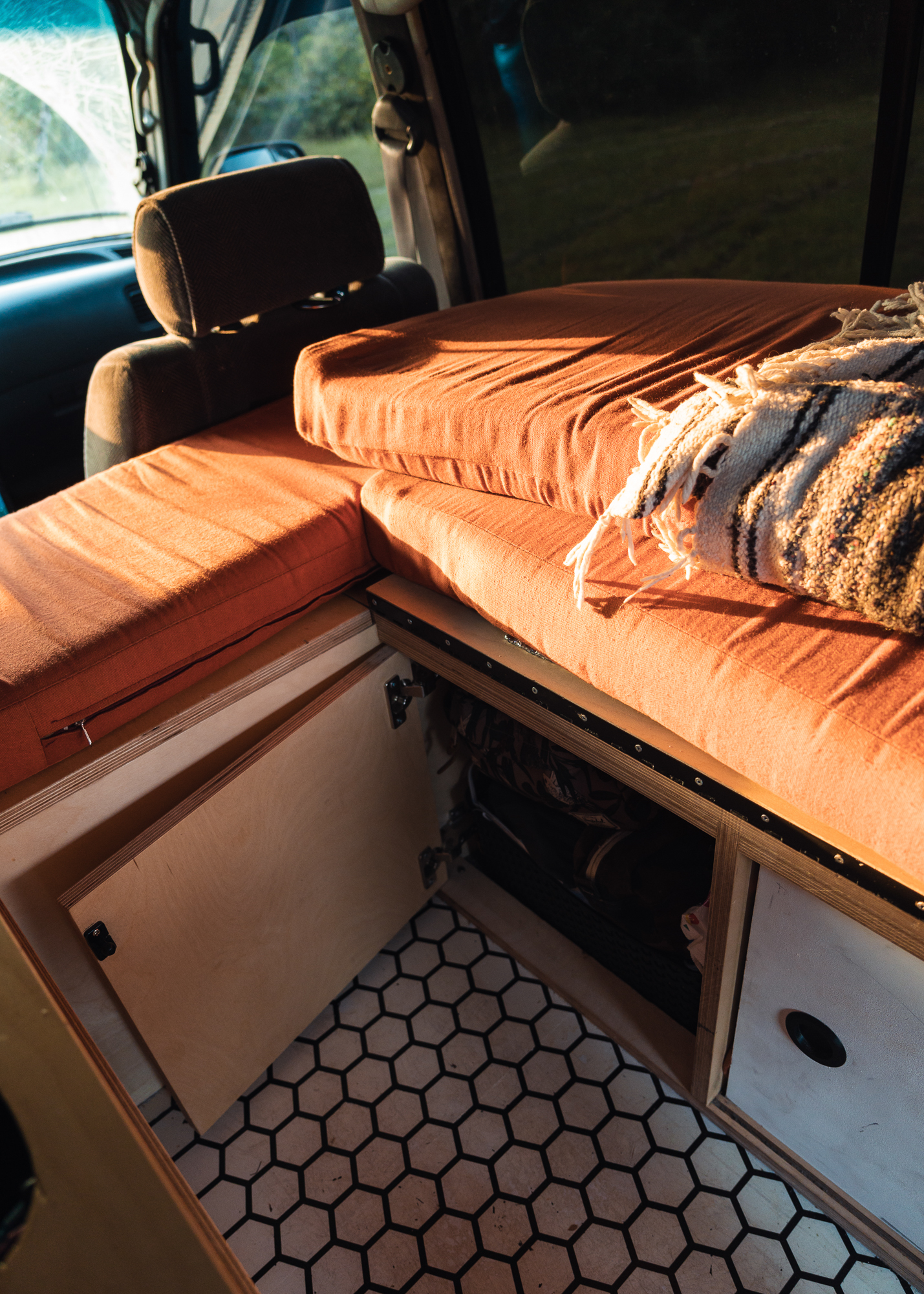 Living on the road means we will run into places where we may need to be less conspicuous [while] sleeping in our vehicle. When stealth is needed, we sleep down below on our fold-out bed. This is made up of our bench and a fold-out board that is attached to the top of the bench using a piano hinge. When making the secondary bed, we simply fold over the leaf and place the edge of the board on a strip of wood that supports the board along the side opposite the bench. It’s a bit squishy sleeping on this bed, but it works for times we need to be sneaky about car camping or camping in an area with strong winds.”