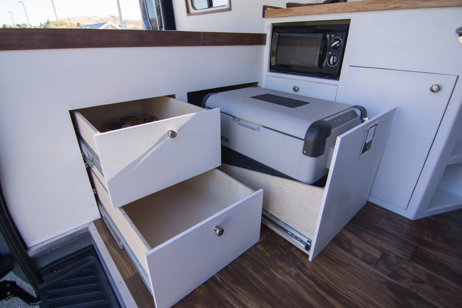 All conversions are one-off custom projects specifically designed for the individual. Do you like to surf? They’ll design a pass-through from your gear garage into a bench in your living space so that your surfboard can fit. Are you a mountain biker? In that case, a slide-out tray with bike mounts could help you pursue your passion just a little bit easier. The idea is to build the campervan around the individual instead of asking the individual to adapt to a pre-designed layout.