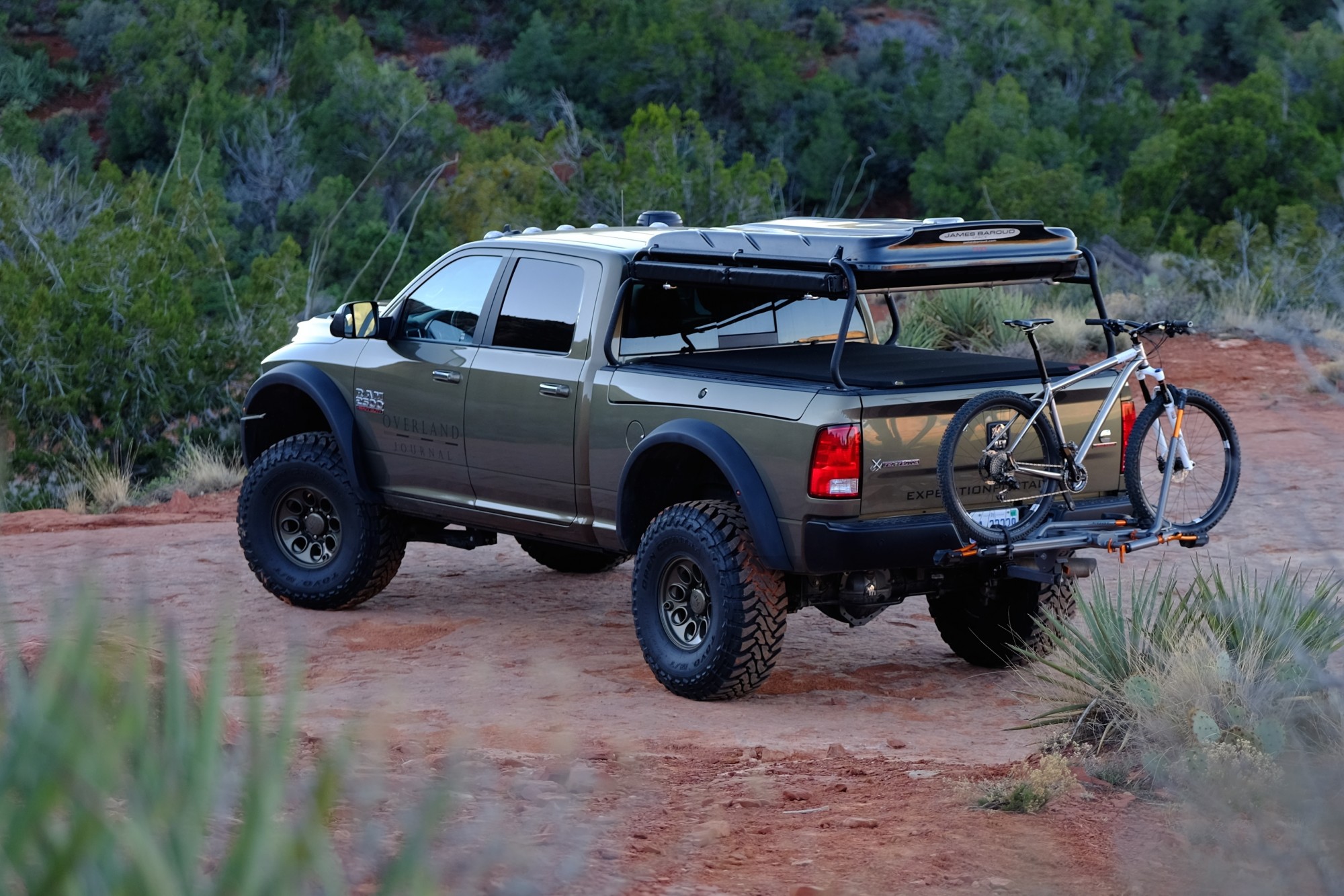 With front and rear lockers, an onboard air compressor, Ram’s own storage boxes built into the sides of the bed, and a finely appointed interior with all the luxuries any overlander could ask for, the Prospector is a formidable traveler. That bed is capped with AEV’s own tonneau cover and tubular cargo rack fitted with a James Baroud hard-shelled roof top tent.