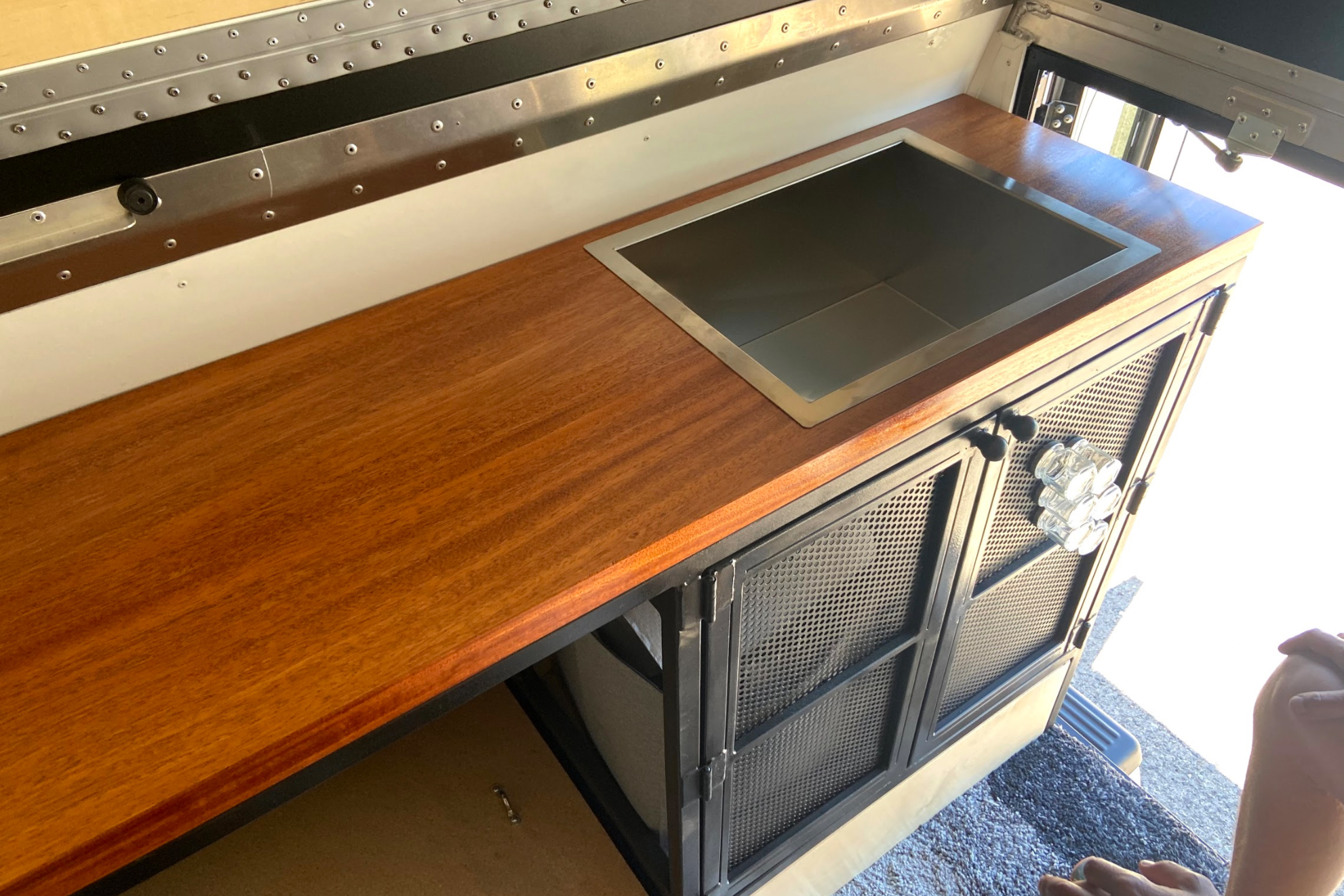 The Hiatus camper and layout is amazing. The layout is L shaped with bench seating and massive amounts of storage. We have a stunning little kitchen area on the passenger side with a mahogany countertop (made by Summit Woodworking in Tucson). We installed a Ruvati sink, a Costway fridge that comes out on sliders, a Yeti 1400 solar system, Maxxair fan, Yakima roof rack, a Wilco swing arm with a 1Up bike rack, and some other odds and ends. All the [seating] and kitchen are made of steel with birch wood. The best part is that all the wood panels are held in place by magnets. Each birch-wood panel can just pop out to be refinished, painted, or fixed over time with great ease. Also, by being able to pop all the wood panels off of the steel framing, unpacking, repacking, and fixing things is super easy (especially so as not to be cramped or bent over while doing so). Just pop off the panels, do what you need to and slap them back in. We drilled and recessed magnets into the backside of each wood panel.