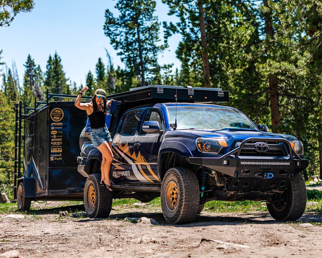 Whether she’s skydiving, jumping out of helicopters in a giraffe onesie, or riding her Yamaha TT-R230, at the end of the day, Cristin Whetten returns to the 2015 Toyota Tacoma that she calls home. Known as Badass Brunette on Instagram, Cristin bought the truck brand-new nearly seven years ago, admittedly knowing nothing about offroading, camping, or overlanding. Nonetheless, she started attending meetups and trail rides, saw vehicle modifications of all kinds, and, over time, realized the direction in which she wanted her own to go. The current version of her Tacoma build has been years in the making and affords Cristin the opportunity to be as self-reliant as she chooses.