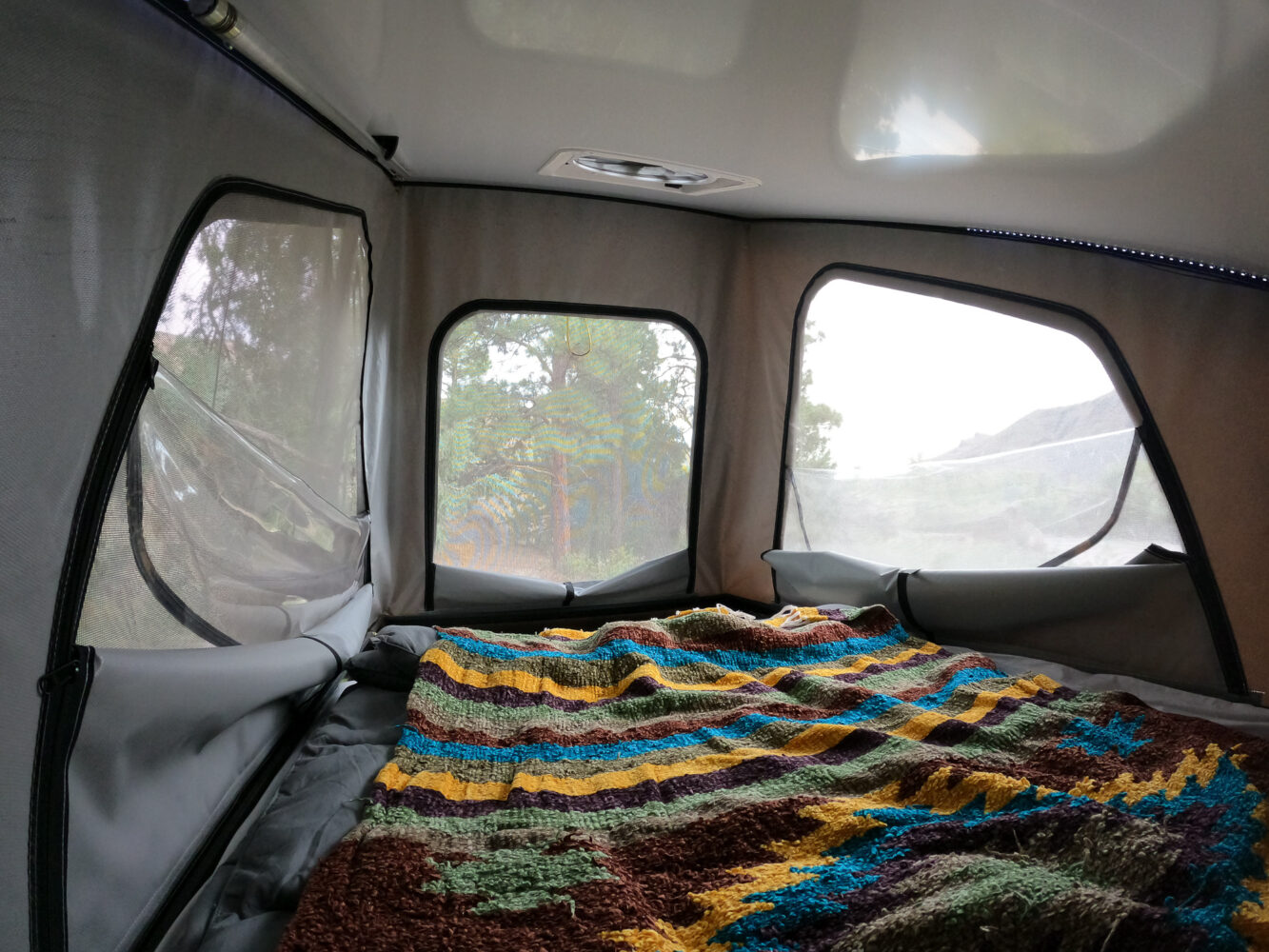 The greatest thank you is to Drew Sterling for his help with the camper build-out itself. He is a contractor by trade, so he knew exactly how to build the two slide-out drawers on the passenger side. We did the rest of the framing, benches, and build-out together. Drew and I spent some very long hours under his carport in the middle of winter, bringing the vision to life. I couldn’t have done it without his help, so big credit to the creation is for Drew. Primary materials were 1-inch aluminum square tubing, Estos connectors, and 1/4-inch birch plywood as the panels. The cushions were also handmade. I took 3-inch foam, cut to bench size, and hand-sewed Mexican blankets as covers.