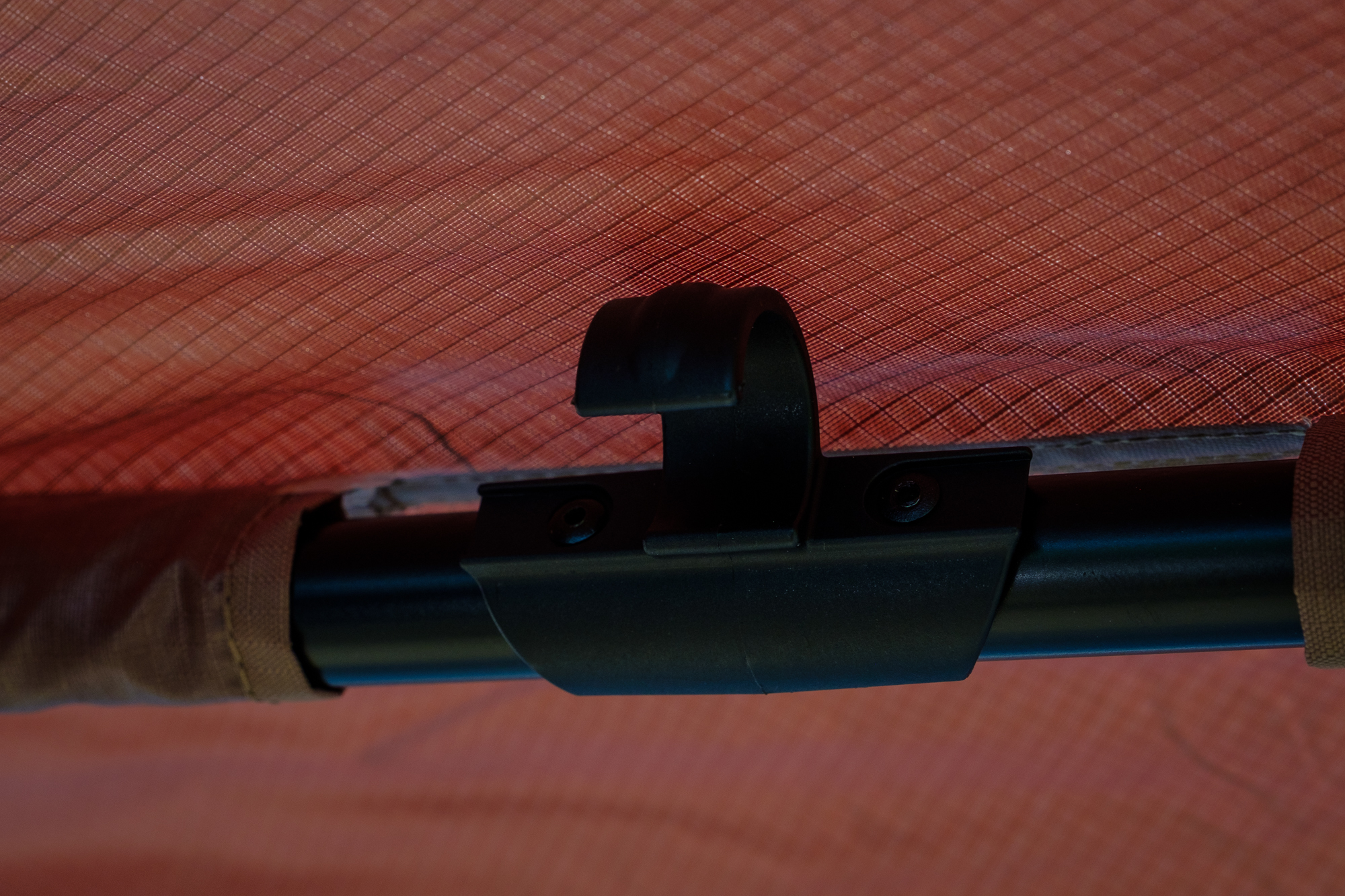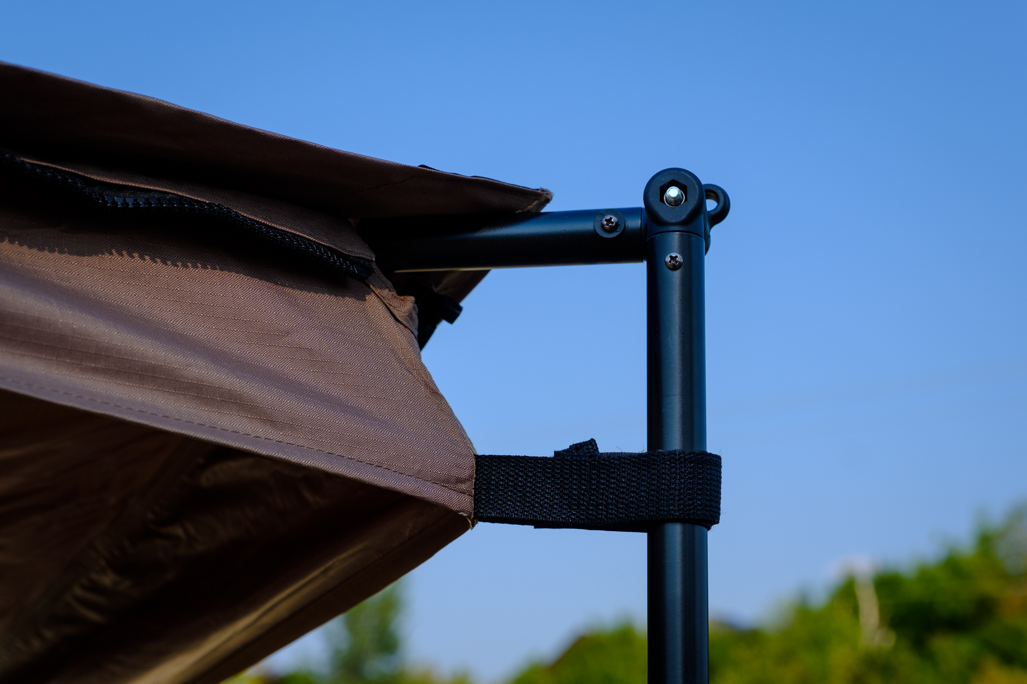Once the awning was fully deployed, there were even more changes we loved. For example, the switch from dark green fabric, which tended to absorb and radiate heat, to a lighter tan alternative. This small alteration made a big difference in keeping us cool, and the 210D ripstop fabric carries an independently evaluated UV50+ rating, so you can feel confident that you’re getting real protection from the sun. It is also water and mold resistant, which is a huge deal when you use the awning to escape rain as much as we do. In the photo above, we were hit by a surprise sleet storm, and shortly after were inundated by other people taking cover without an awning. We then stored it away wet for three weeks in hot conditions without opening it to dry. During the course of these 21 days, temperatures often reached the mid-1990s, but upon rolling the awning out, there wasn’t a spot of mold.