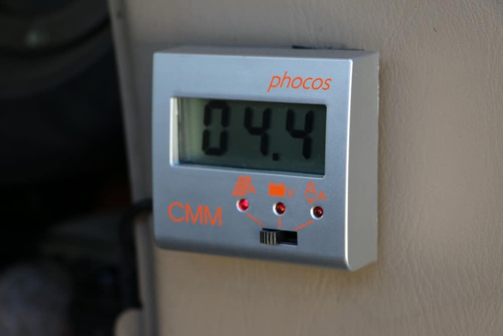The second day of the test brought better weather with blue skies and scattered clouds. To my great satisfaction it also brought the battery back up to 12.7 volts by 0930, and the panel was pulling in around 4 amps consistently. By mid day the incoming amps were jumping between 4.4 and 5.0, and the battery had actually come up to a full 13 Volts, which is higher than when we had started. By the third morning the battery was back at 12.9 and rising, meaning that the panel had done more than just meet its claim of running a fridge for two days, but showed it could run one indefinitely with fair weather.