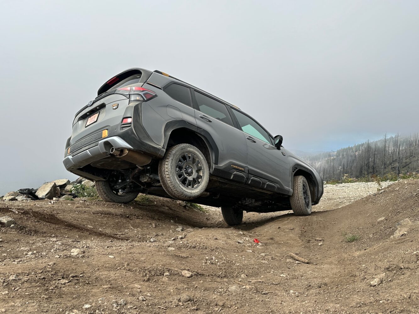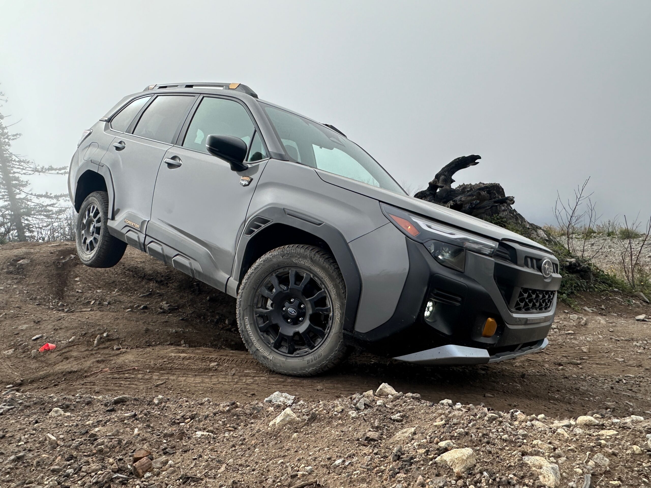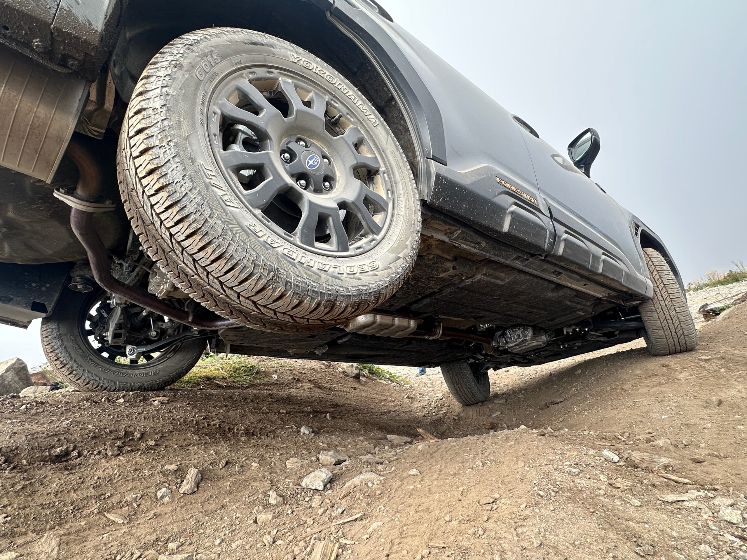 Those electronic aids worked seamlessly in low-pace trail work, especially the hill descent control. The driver modulates the set speed of the descent intuitively with just the throttle, and the front-view camera highlights terrain features with exceptional clarity on the 11.6-inch center screen. The shorter final drive ratio (4.11 versus 3.7) and manual mode (actuated by flappy paddles) for the Lineartronic CVT also help with vehicle control at walking speeds. The approach (23.5 degrees), breakover (21 degrees), and departure (25.5 degrees) angles are improved thanks not only to the increased ride height, but the carved-out body work as well. In my own travels across the American West, I often find Subarus of all stripes parked at the end of very gnarly trails, so the Forester Wilderness’s acumen off-road is not especially a surprise.