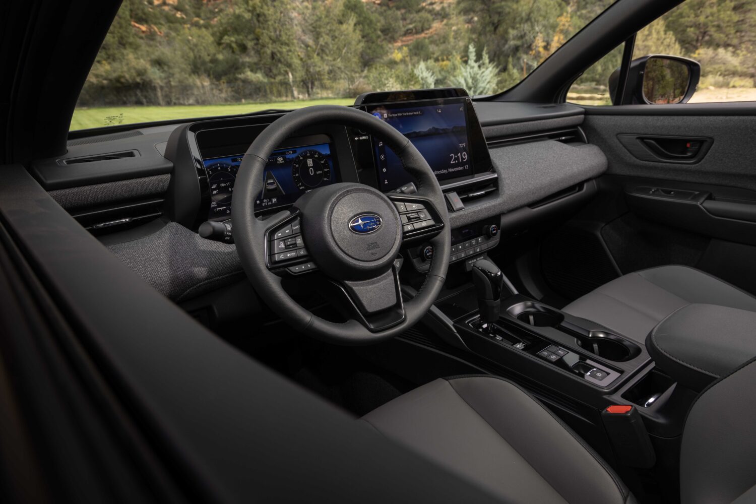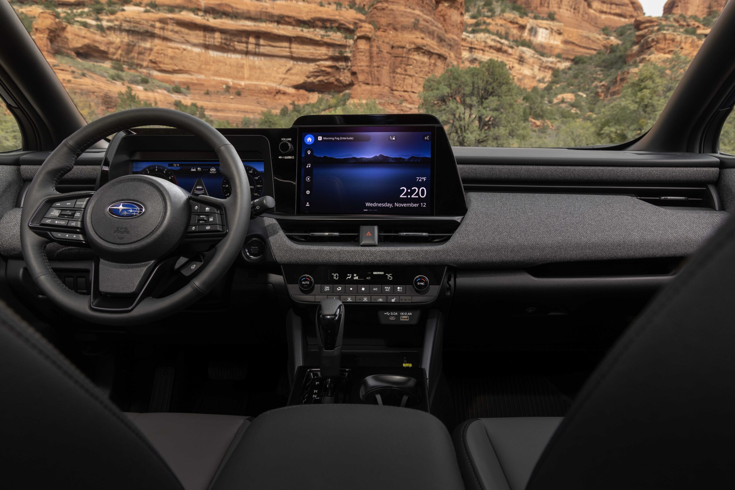 Up front, there are other significant departures from the 2025 Outback. Subaru designers emphasized the horizontality of the new passenger cabin, one that’s now dominated by a center 12.1-inch multimedia touch screen, paired with a 12.3-inch digital instrument panel for the driver. All the climate vents are turned on their sides, and the general sweep of the dash and the admirably low cowl emphasize the new linearity. Subaru wanted the upper part of the dash to be uncluttered and minimalist (the only physical switch above the beltline is for the multimedia system’s power/volume knob), while the lower dash hosts all the interior’s functional aspects. To the sound of much rejoicing, we discovered a whole swath of cleanly mounted and labeled physical knobs and buttons (including on the steering wheel) to control key functions like climate and heated seats. Subaru was listening again—Outback owners complained about navigating touch-screen menus to accomplish basic and frequently used in-car commands, so they returned many of those to their rightful place in the 3D world.