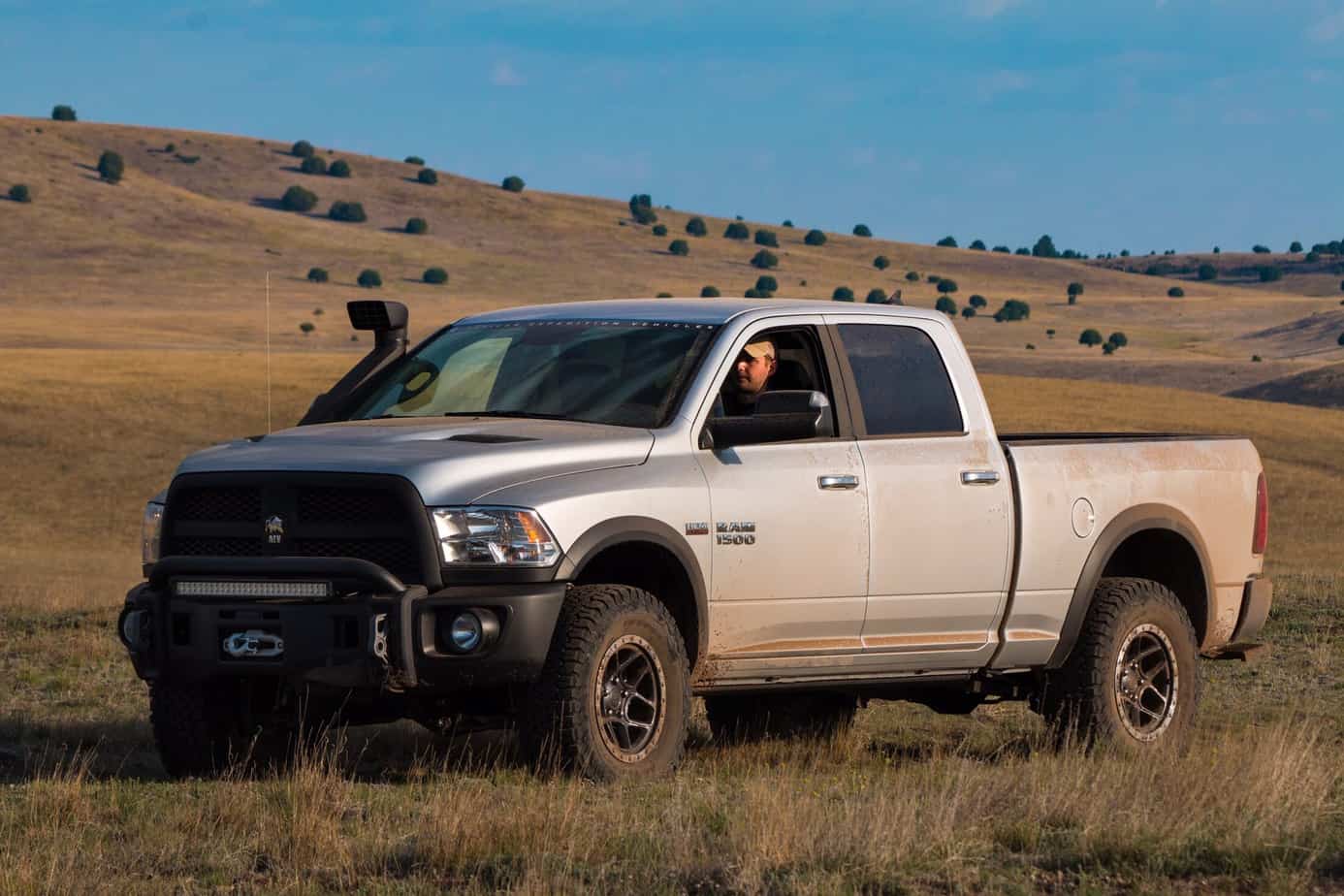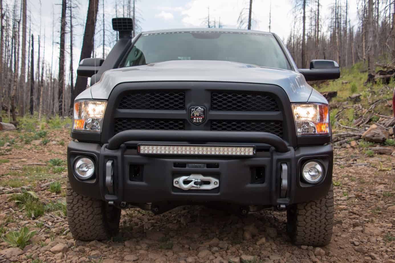 Overall clearance is good, but the Recruit does feel a little low amidst the AEV Prospectors and JK’s. The seating position of the 1500 is flatter than in the 2500, which reduces visibility over the hood, and makes it harder to confidently navigate the trail. We also noticed that the front left tow hook rubbed in the dirt twice during the week, which leaves something to be desired from the approach angle. Even so, the engineers’ work relocating the axle center above the skid plate is nothing short of brilliant, and when combined with the four inches of lift and 35″ tires, provided enough clearance to make every obstacle on our trip a drama free affair. Sure, an additional inch of lift or 37″ tires would be nice, but they’re far from necessary.