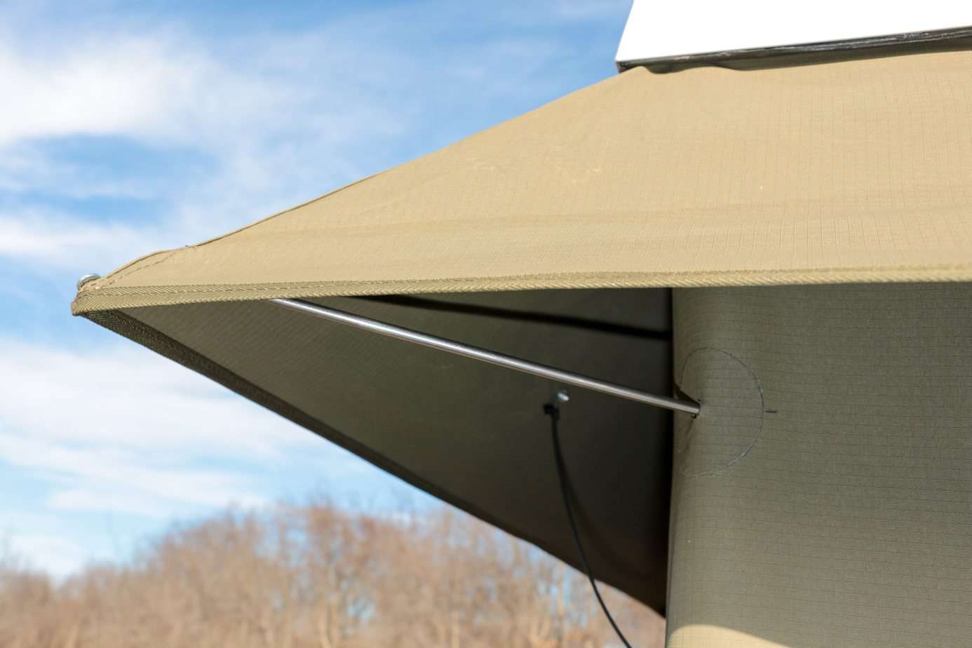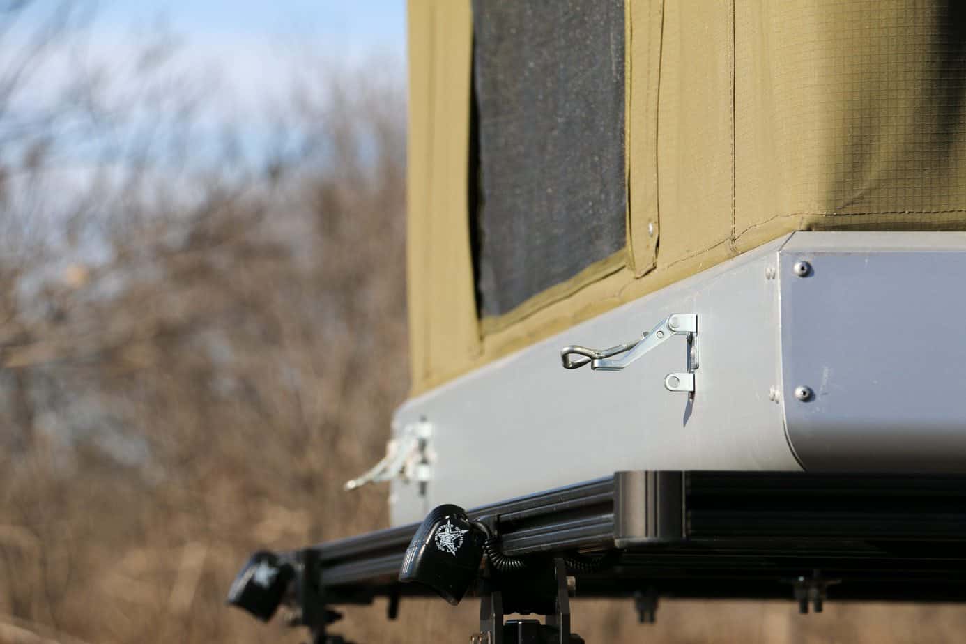 Overall the fit and finish of the tent seems good, but not perfect. The body is well sealed, welds appear strong, and the zippers all functioned easily, but I can’t help feeling like they rushed certain aspects. Rivets were occasionally used in fabric only junctions where a good stitch would have looked cleaner, excess thread was left in random points, and one or two welds could have been ground down more, but it is the ladder and mounting method that bothered me most. Instead of a rail system or even generic brackets, new owners must measure where they want the tent to go and drill holes through the aluminum floor. They then need to run the hardware through and seal it with silicone to prevent leaks. The ladder feels unfinished as well, and the two piece system must be cut to length before use. None of that mattered when mounting it to the trailer, as we had plenty of utility rails and no use for the ladder with the fenders for steps, but vehicle applications would be much more difficult.