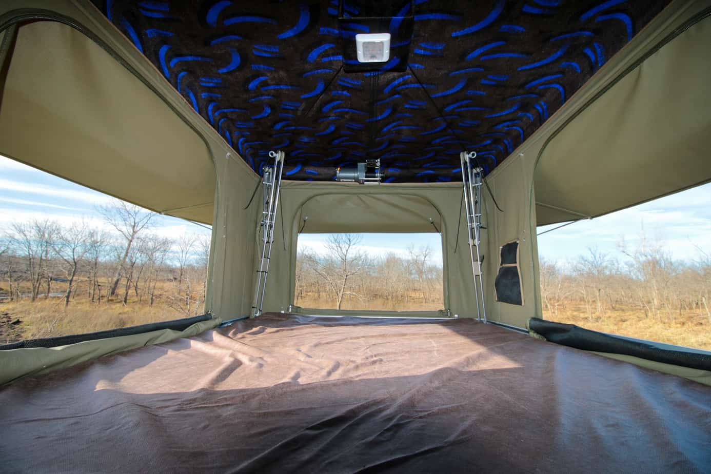 The interior is spacious at 40 inches tall, 50 inches wide, and six and a half feet long, but the mattress is where they went over the top. While James Baroud’s beds come in at three inches thick, and Autohome’s total up to 2.6 inches, the BunduTop mattress is a full 4 inches thick. The difference is immediately clear when laying down, and my bad back was thankful for the extra cushion. Other interior features include an LED light for late night reading and visibility, mesh pockets, and two 12V sockets for charging phones or other devices. These charging ports were another big selling point for our team, as keeping several cameras and GPS units alive on the road is a constant challenge.