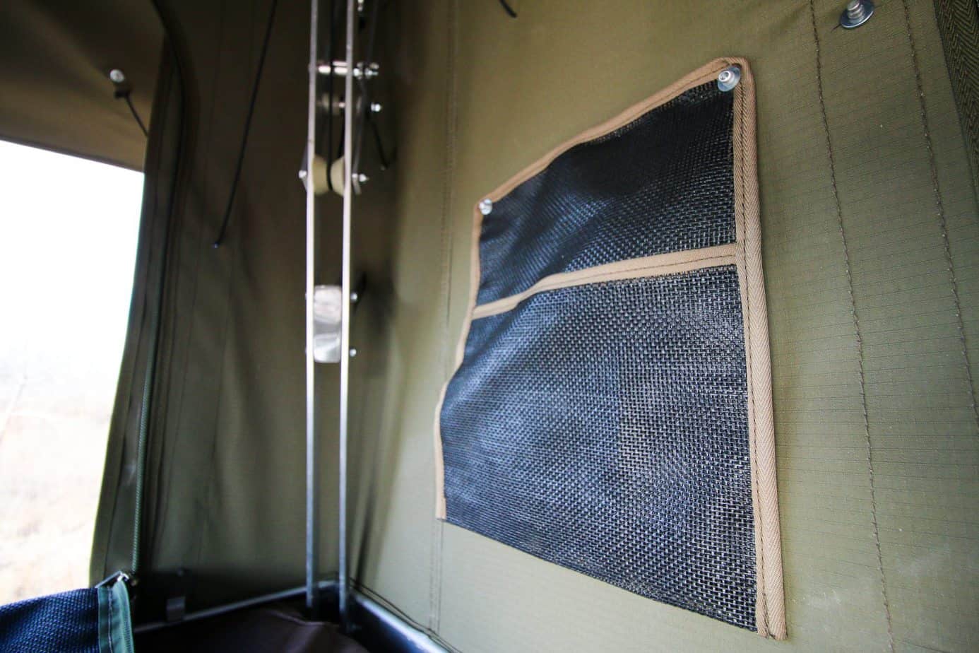 The walls and awning are made from a heavy-duty ripstop canvas that is thick and weather resistant. I loved that they chose to use this style of fabric instead of a more technical alternative, as it feels richer, and more like a traditional South African roof top tent. Each of the four large doors provides a great view of your surroundings, and contains a layer of mosquito mesh for ventilation without the bugs.