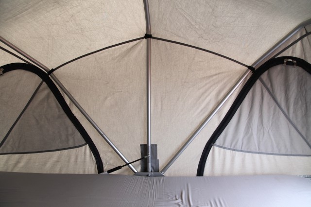 Once deployed, it’s obvious there is something different about the tent. The most unique feature is the aluminized synthetic fabric. Proprietary to James Baroud root top tents, that heavy-duty fabric is fully waterproof, resists UV damage, and reflects harsh light providing for a cooler tent interior. To further improve internal temperature control, the tent has two full-size mesh doors and four large zippered mesh windows. Not only does this create a pleasant panoramic view, it does wonders for air pass-through on warmer nights. The tent can also be fitted with an insulated liner for use in extreme cold weather.