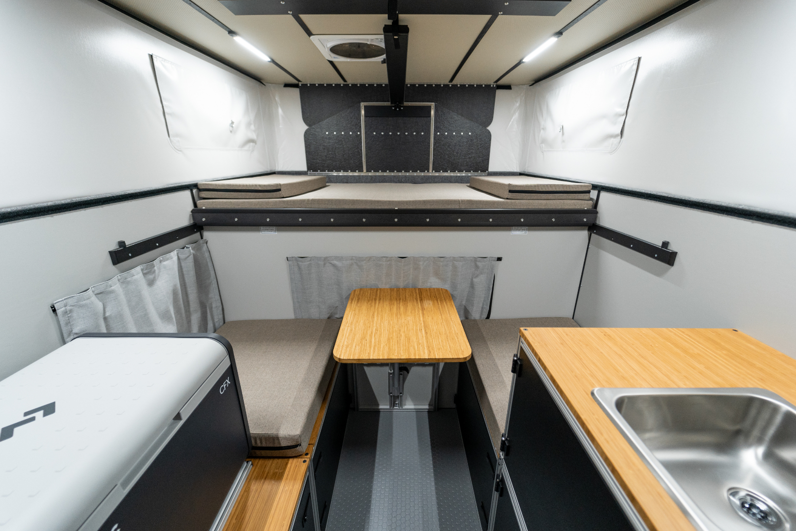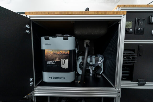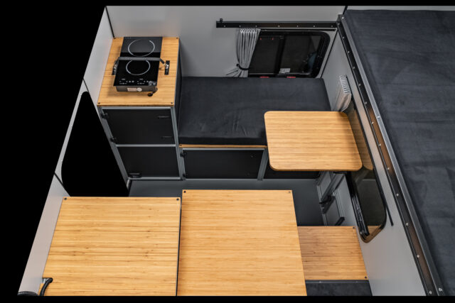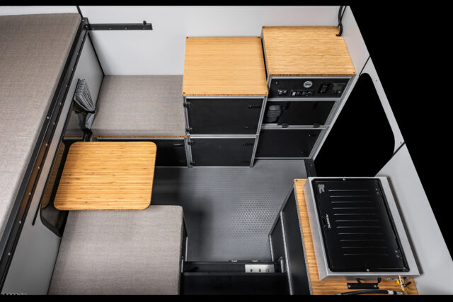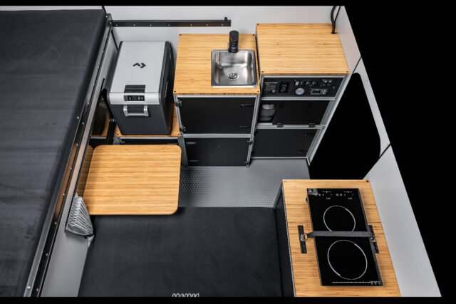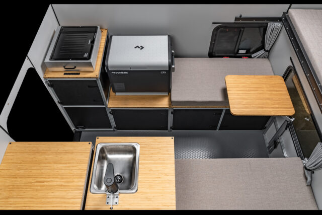“Build Your Way” is the philosophy behind CampOut’s design, allowing owners to personalize the interior as they see fit. Modules feature modern bamboo countertops, slotted aluminum extrusions, polypropylene honeycomb panels, and HDPE doors fitted with compression latches. The interior can be expanded or simplified based on user preference, allowing for easy customization. Some may choose to include a Dometic-based Water Module complete with a built-in sink, pump, and jugs for fresh and gray water, while others might opt for a tall storage compartment instead. The Fridge Module can house a removable Dometic CFX chest refrigerator or be replaced by lockable storage for those who prefer to pack their own cooler.
