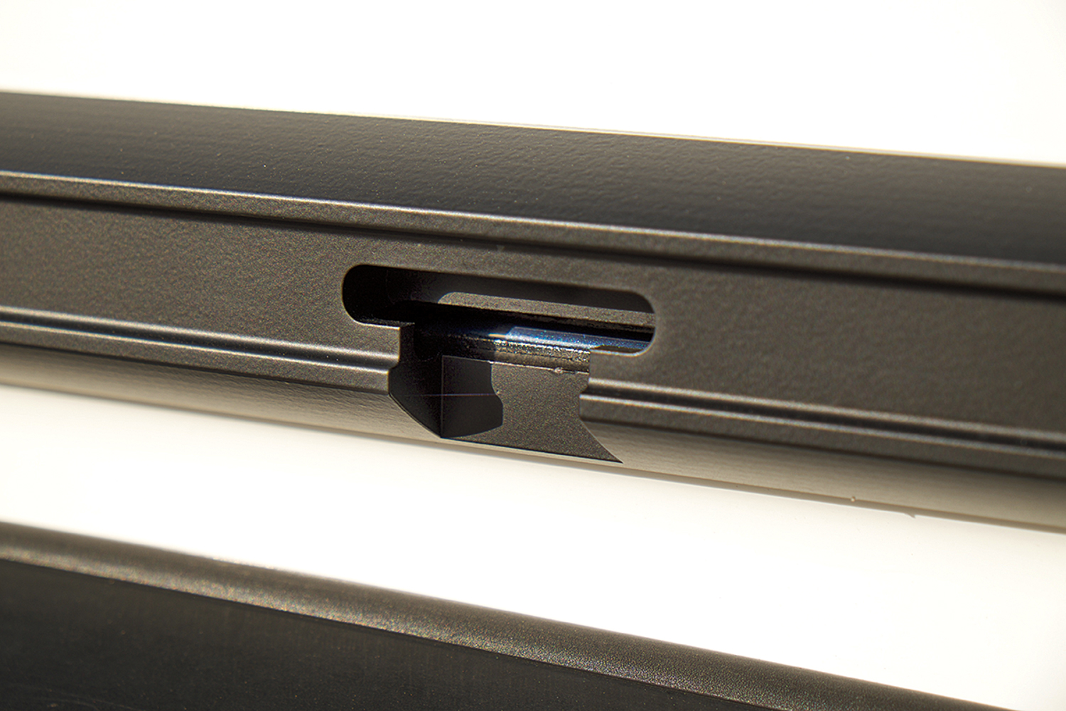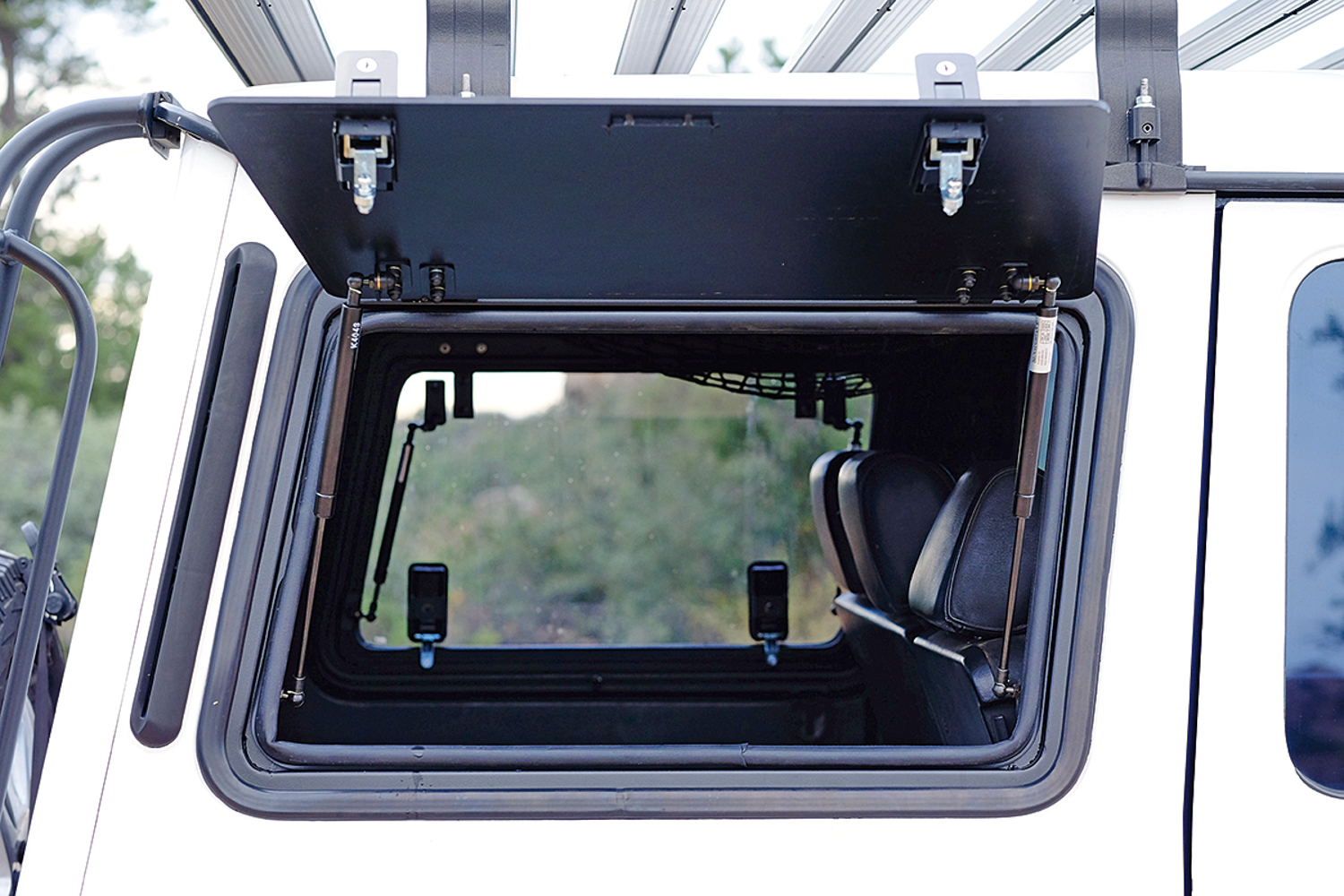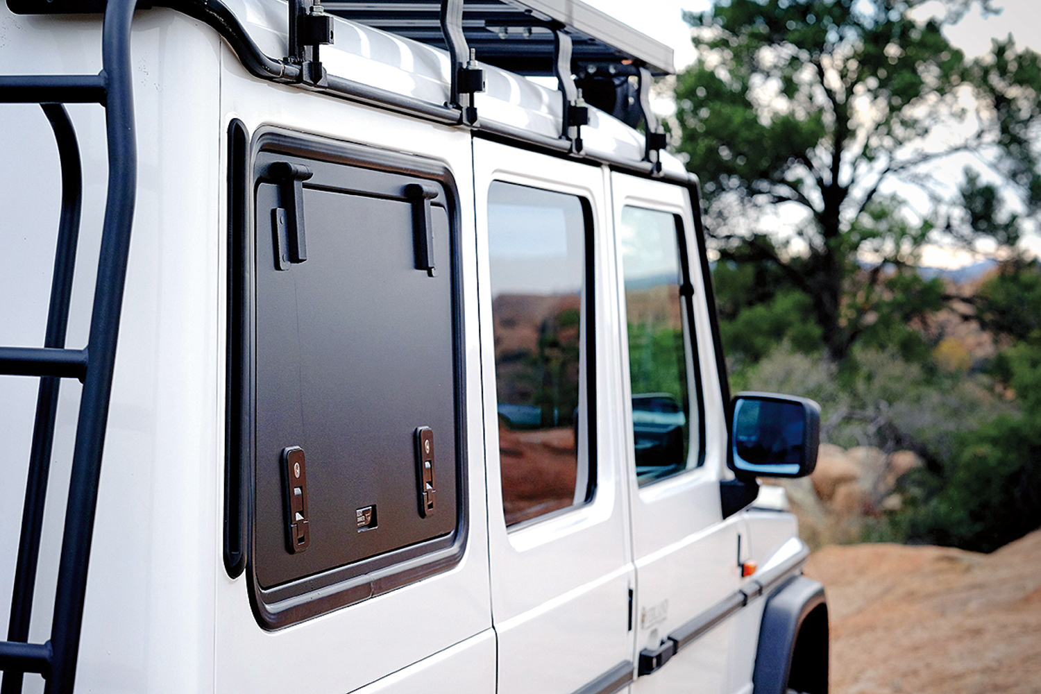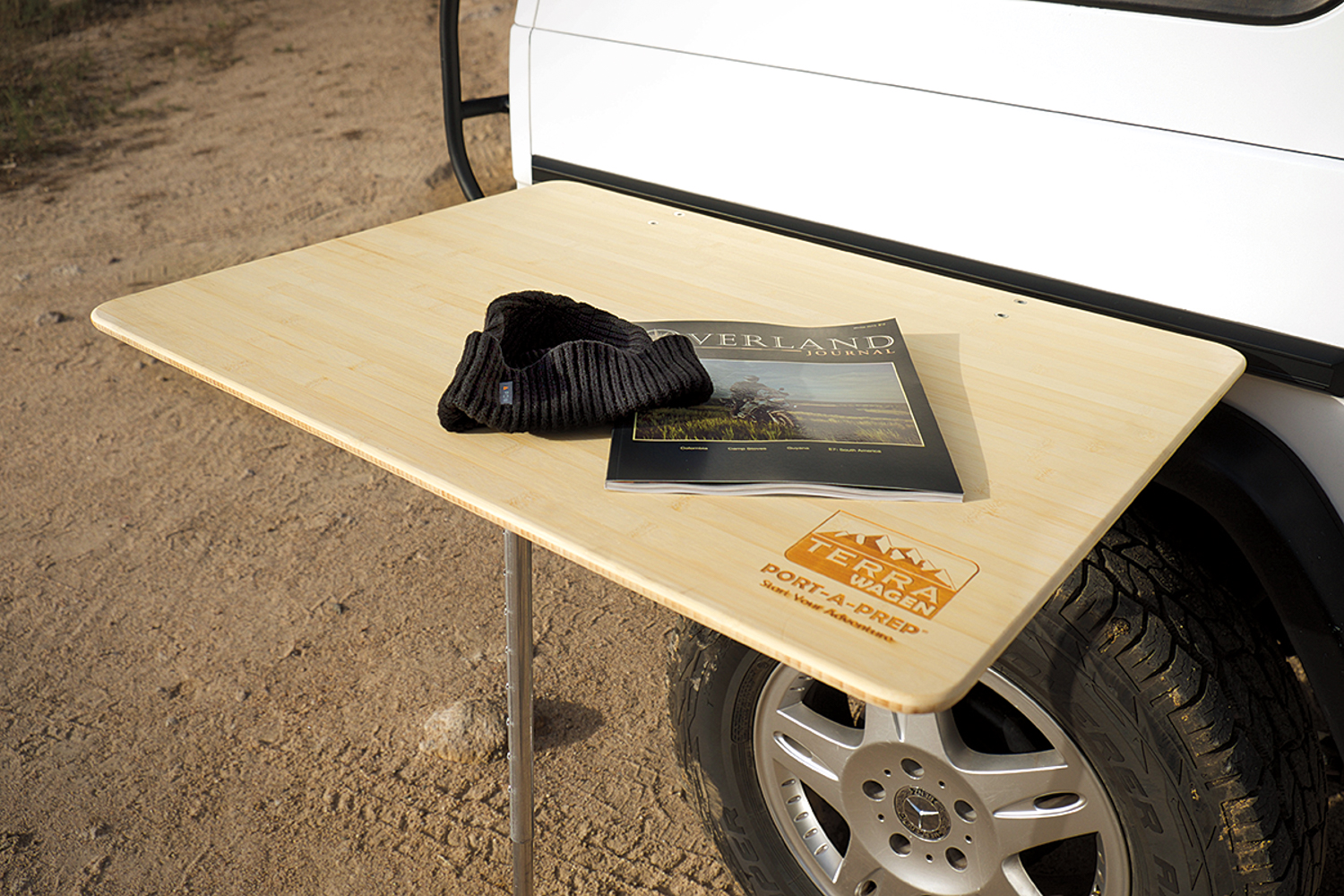 The final exterior modifications implement three innovative products. The first is a GWA storage panel that takes advantage of the void in the spare tire. This door finishes off the unsightly reversed wheel and allows me to store a recovery strap, several screw pin bow shackles, and a pair of gloves. The second, and one of the more interesting changes, was the fitment of the Front Runner gullwing windows, which are available with either solid aluminum panels (black powder-coated) or tinted glass. On the G-Class, these units are quite useful, easing access into the large storage area aft of the seats. With the aluminum plates installed, security is significantly improved, but at the cost of rearward visibility. Even so, I like the aesthetics of the product and after trying both options ultimately selected the solid metal solution. Each side has two locks and came key matched. The last accessory is a G-Wagen-specific table by Terra Wagen that is pure engineering art. It is rare to find a product that is so innovative and built to such quality and precision. Installation starts with a solid piece of machined aluminum that perfectly matches the profile of the factory body trim rails. In a few minutes, we had removed the OEM rail and installed the unit with the supplied high-strength, double-sided adhesive tape. This new structure provides the mounting for the back edge of the exquisite bamboo table. Two T-bars slip into the machined slots and then the front surface is supported by a single telescoping pole—absolutely brilliant.