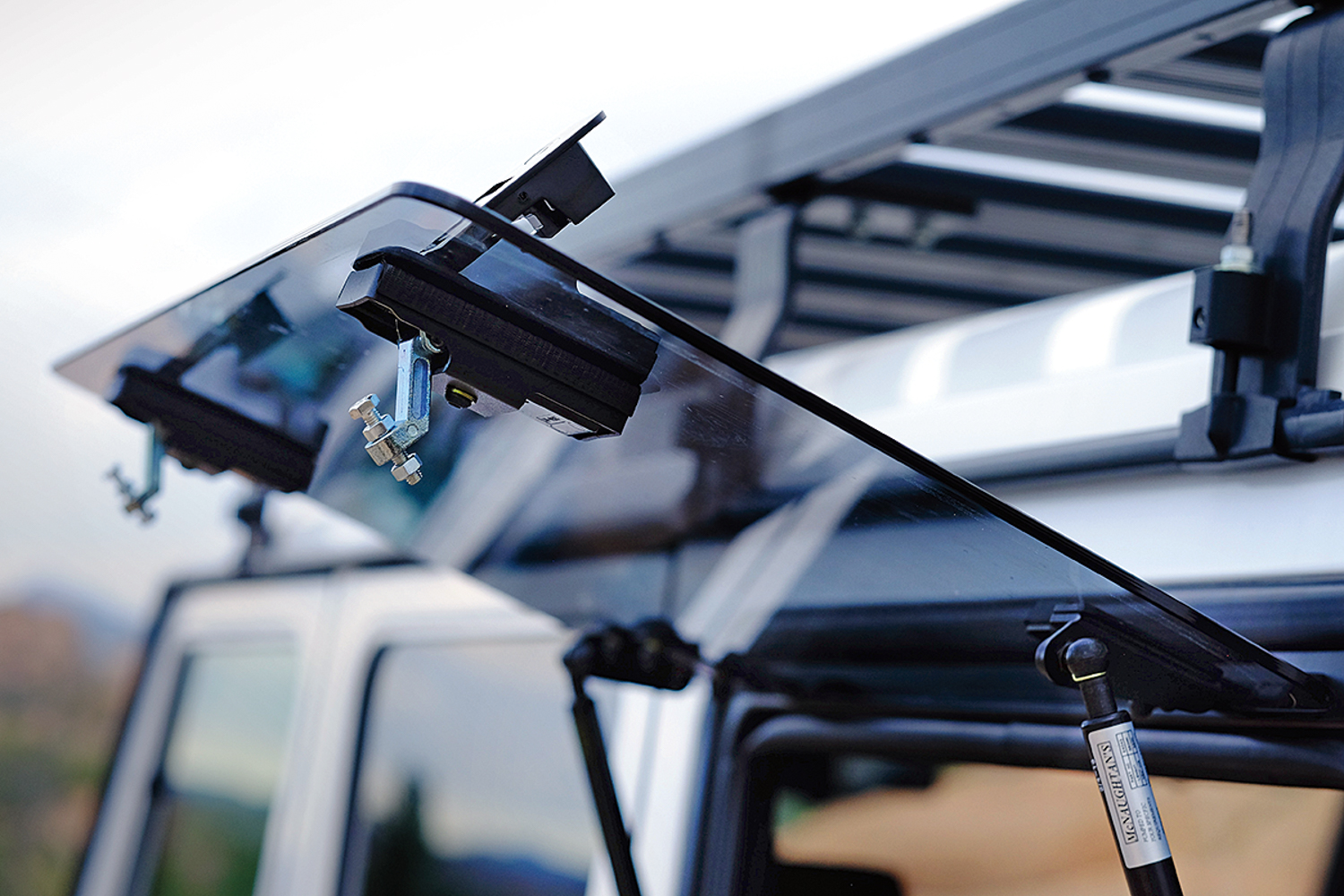 With the technical terrain requirements addressed, it was time to consider other modest modifications to improve comfort and convenience. One of the best ways to substantially increase reserve capacity is by installing a low-profile, lightweight roof rack. The goal is to have a means of carrying temporary loads and extremely light accessories. (For vehicles like this, I recommend roof loads of less than 150 pounds.) The roof rack also provides a flat surface for sleeping off the ground (yet under the stars) or as a photography platform. We selected a modular Front Runner aluminum rack which allows for a nearly unlimited combination of cross slat spacing. To access the rack, a GWA steel ladder was chosen and mounted securely to the rear body mount and drip rail. To the front of the rack are four Baja Designs HID lights, the outermost units serving a driving pattern and the innermost projecting a spot beam. A matte-black hood decal minimizes reflected light, and we wired the units to activate from factory switches. Even after years of use this rack is completely rattle free.