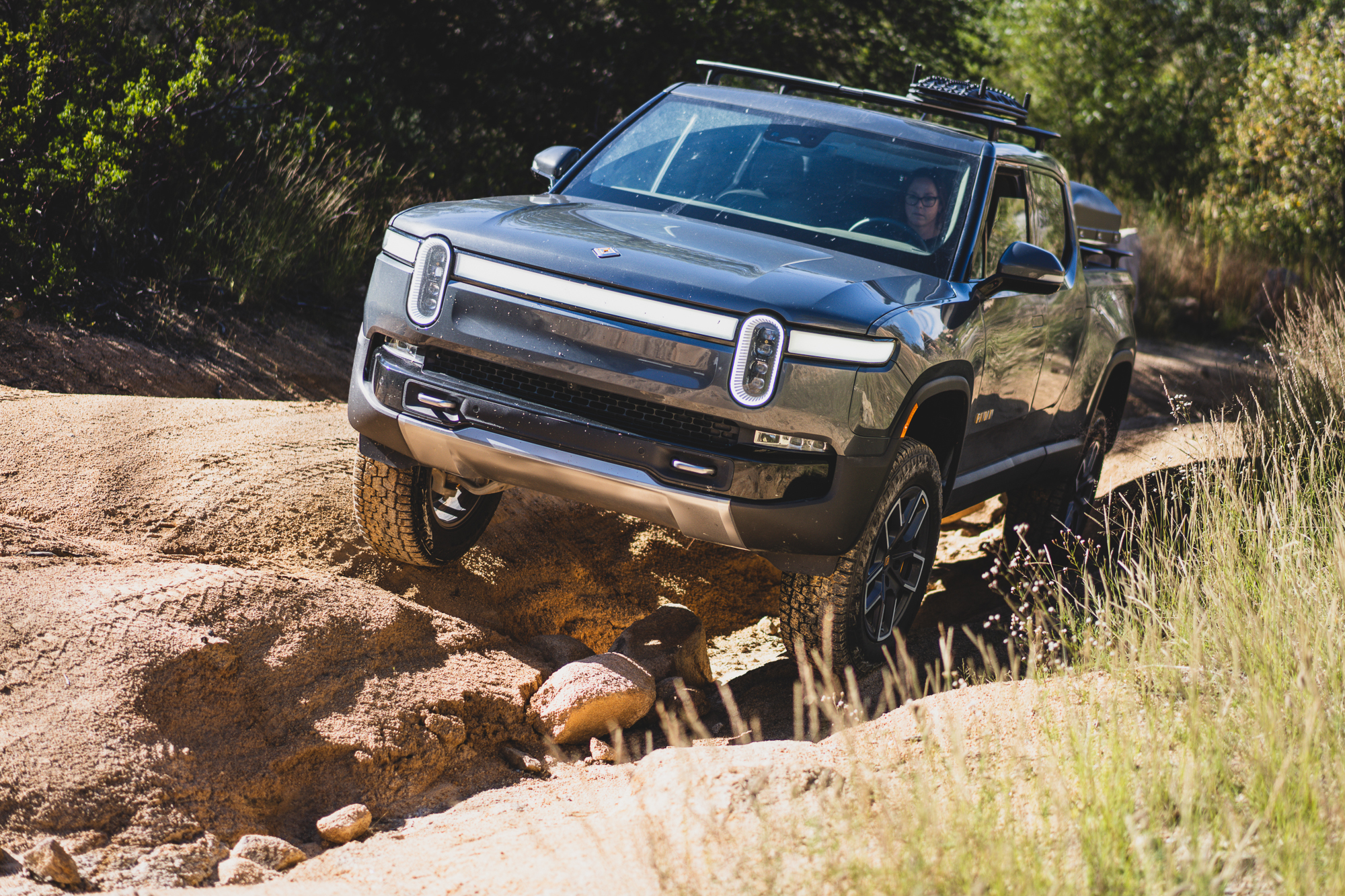 For overland travel, we used the Rivian R1T to travel solo to a remote campsite on the Grand Canyon, requiring 64 miles of dirt travel and nearly 180 miles total between charging. This track included mud, ruts, and loose climbs. The R1T had an easy time with the challenges, but I would like to see a higher wheelspin threshold in mud mode and the highest suspension setting. It had rained overnight, and we needed the clearance due to the depth of the rut, but the mud was thick enough to require high wheelspin to clear the tread. We also tested the R1T on our high-clearance test track (few test vehicles are considered for this trail), and it showcased the 15 inches of ground clearance and performance on rocks and ledges.