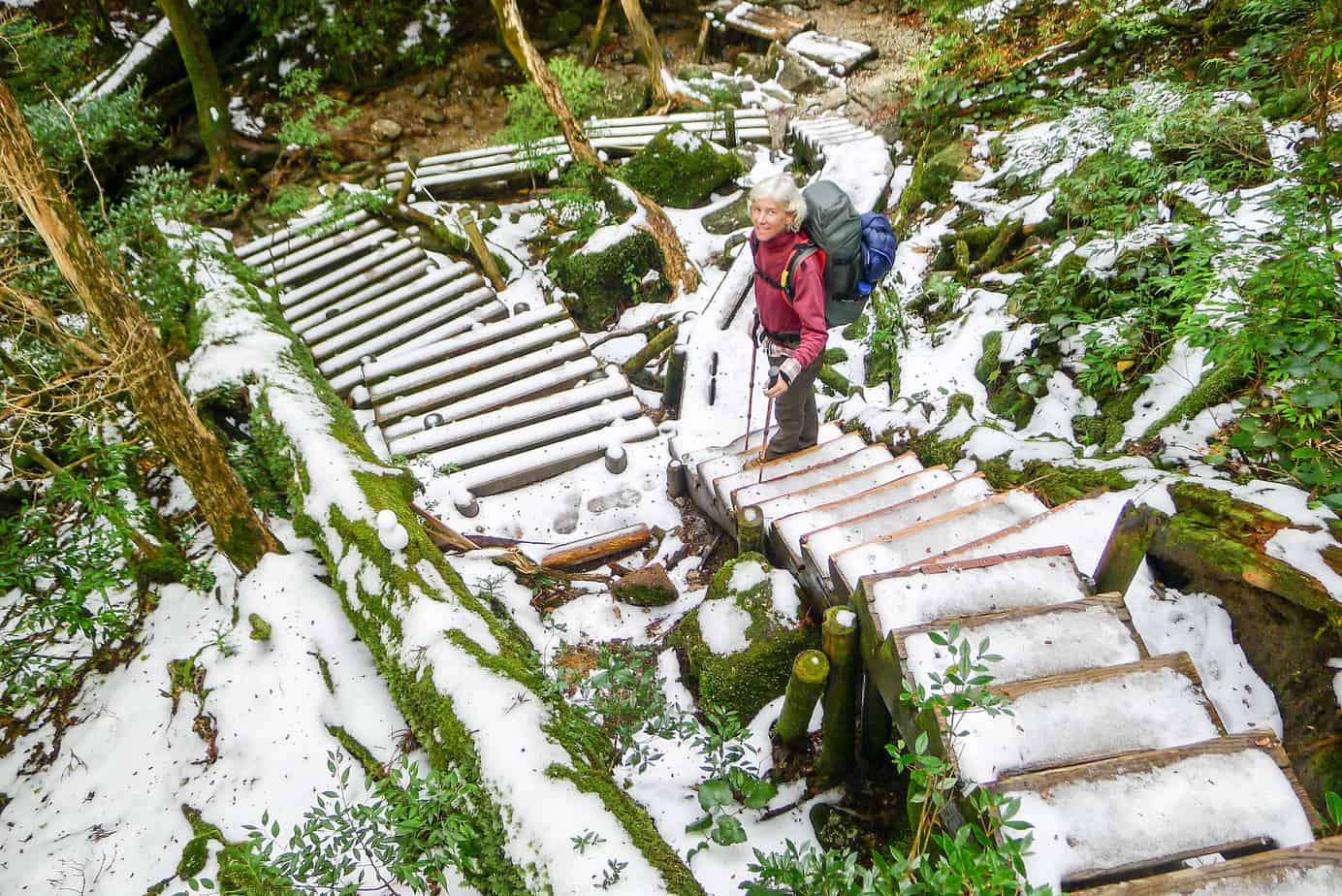 Two beautiful days followed. Cold at night and in the mornings, but quickly warming up once we stepped outside into the sun and hiked, mostly uphill. The viewpoint of Talk-Iwa Rock at 1,050 meters looked out over a valley, the first snow-covered ridge in the distance and a winding river deep, deep below. Part of the trail on day 2 consisted of an abandoned railroad track that had been used for dozens of years to transport timber to the coast. It was an easy to follow the trail as we enjoyed the rhythm of our steps with the sound of the river in the distance.
