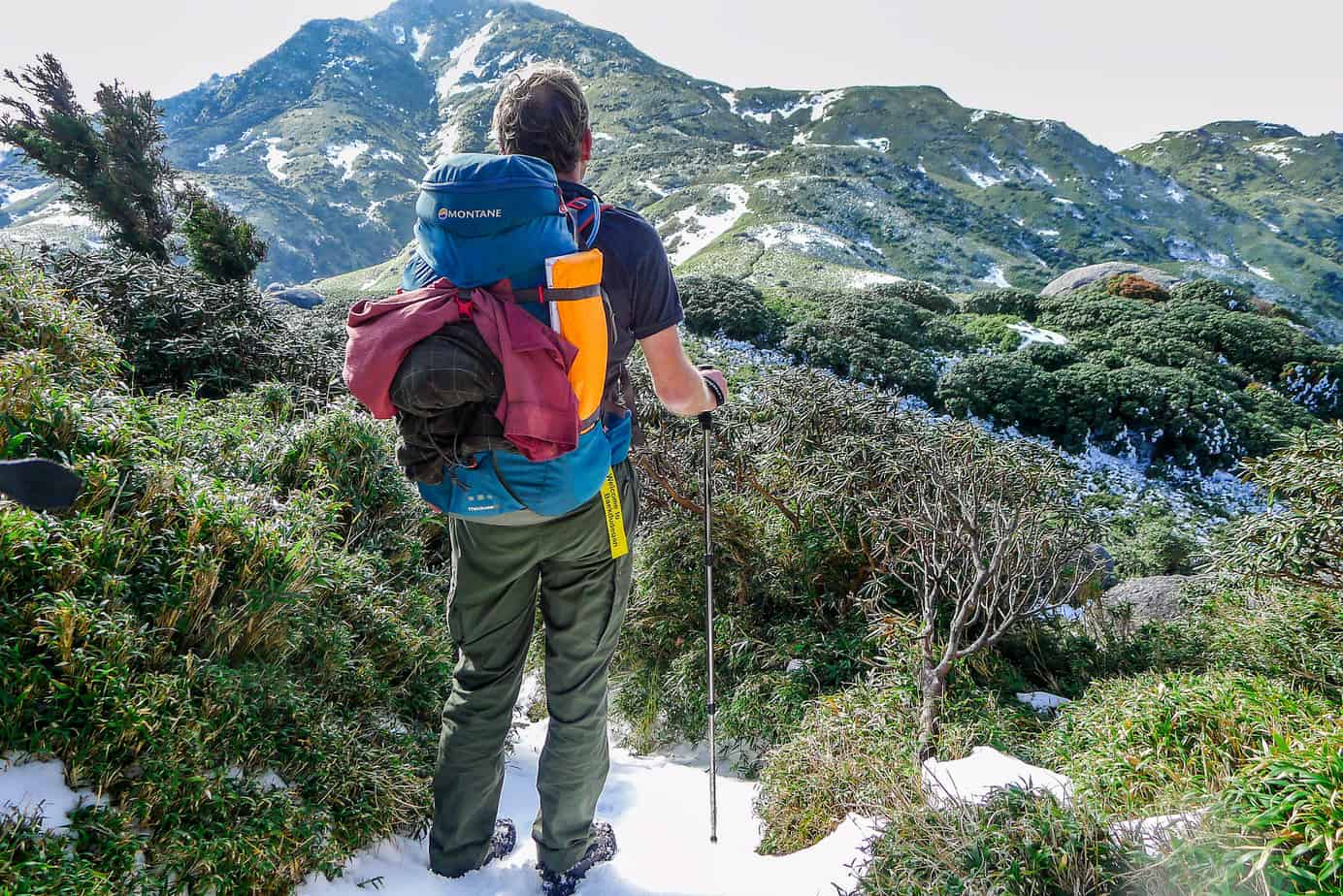 If only the day had had more hours of light so we could have taken it slower, including more stops to enjoy views. However, darkness fell. For an hour we hiked with our headlights on. To say we were relieved to reach the shelter is an understatement. I didn’t even register whether it was made of concrete or wood, whether it was beautiful or ugly. It was empty and protected us from the elements, no matter how cold it was inside. We put on all our clothes and cooked while wrapped in our sleeping bags. While we were having a restless night, the weather gods debated and concluded there had been enough snow. When we woke up it was raining.