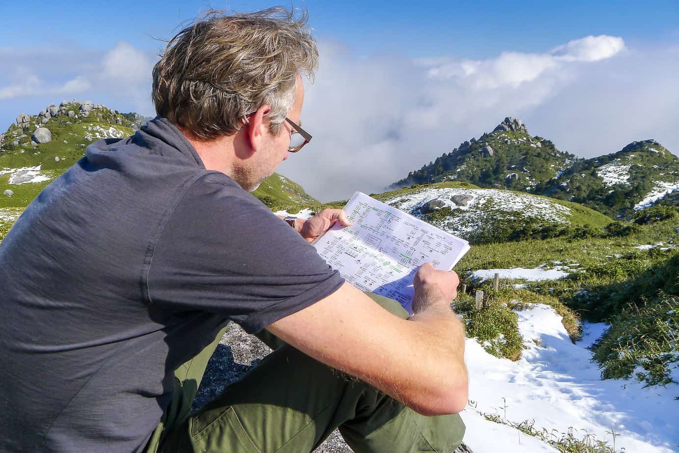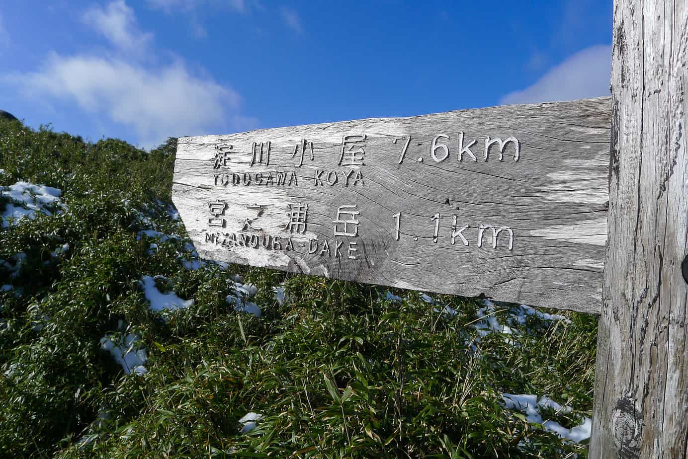 On a bare rock we sat down, took out our MSR stove and cooked our twice-a-day hiker’s dish of noodles with seaweed and mushrooms while we nibbled on a piece of dried fish with sesame seed. We lingered in the warming rays of the sun. Could we stay here forever, please? Rather than taking the same route back, we hoped and anticipated that there would be less snow on the other side of the 1,936-meter high Miyanouradake Mountain. I have no memory on what kind of argument we based this assumption, but in retrospect it was a misguided notion of two people who come from a flat country with little snow. We clearly don’t have a clue what the combination of mountains and snow can do.