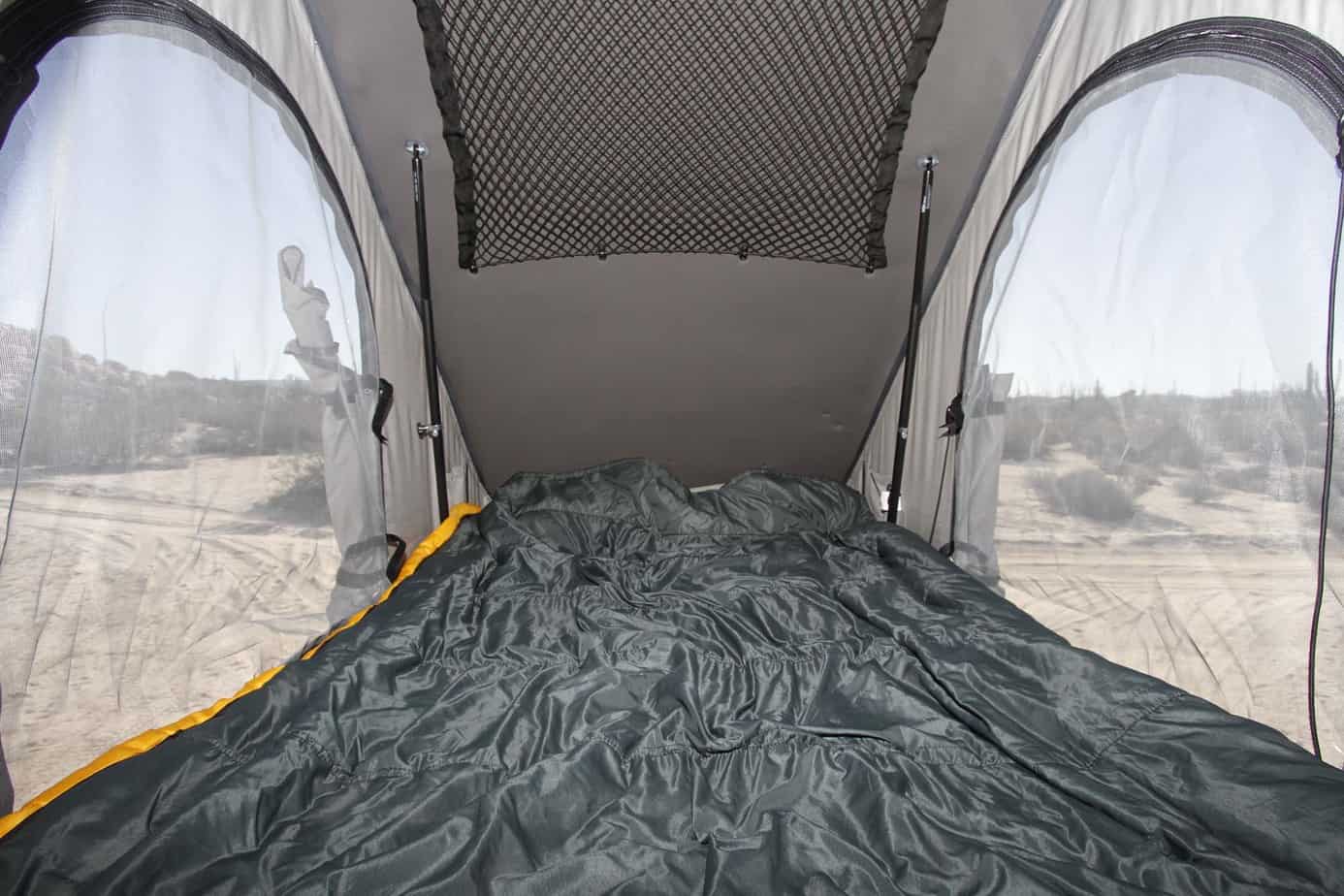 As we would expect from AutoHome, the build is solid, hardware and materials are first-rate, and attention to detail is evident in all quadrants. The clam-style shell is marine-grade fiberglass with a gelcoat finish and is watertight. The canvas enclosure is crafted from Airtex synthetic canvas, and each of the three sides have zip-open doors with both solid and screen options. This leads me to the topic of ventilation, which is excellent. Inside are two pillows and a 3-inch closed-cell foam pad. Other conveniences include interior storage pockets for small items, a ceiling-mounted cargo net (a great place to keep clothes while sleeping), and an LED light.