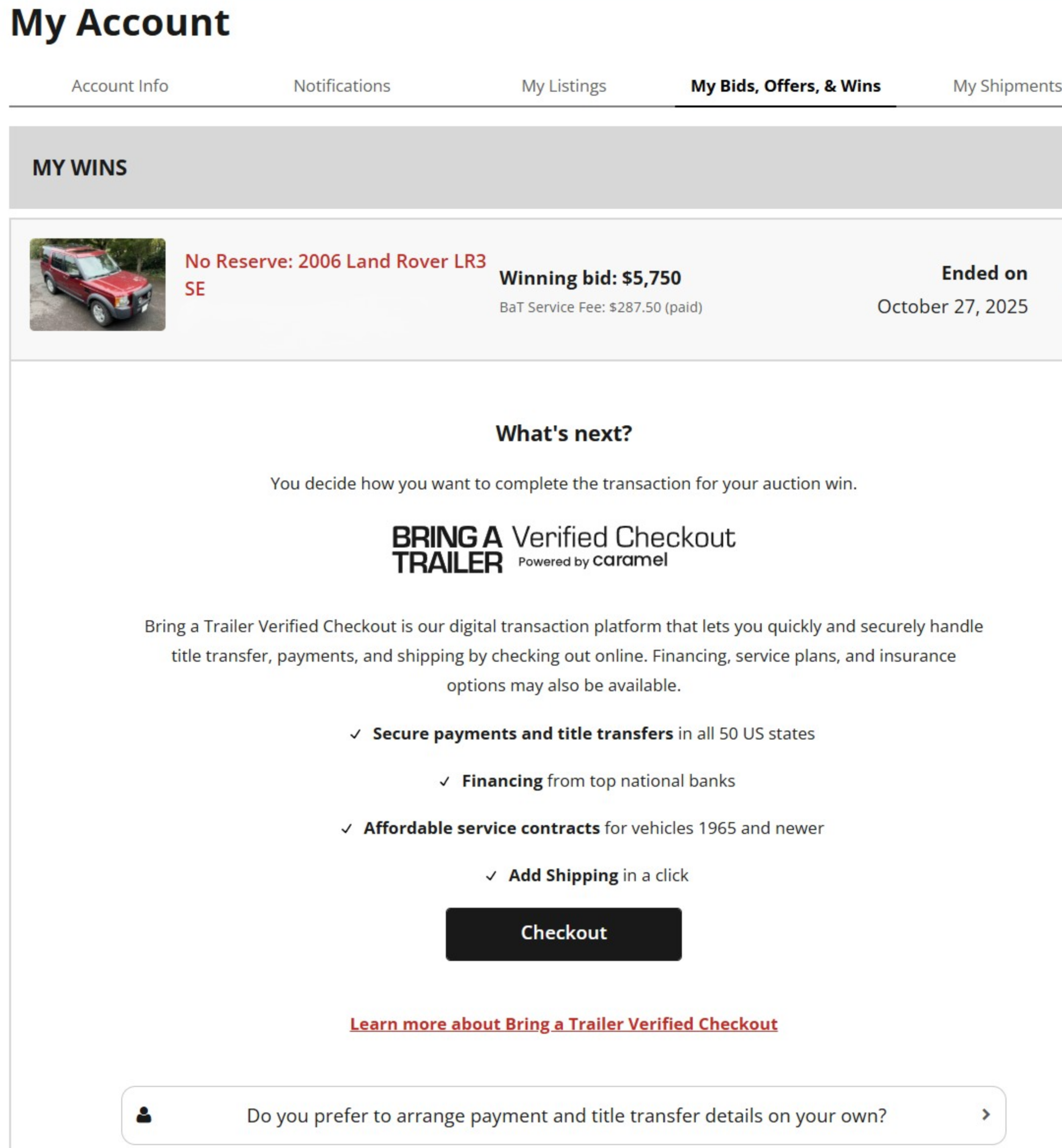 Alternatively, BAT offers Verified Checkout service, available only to holders of a US driver’s license. This service assists in arranging payment, the shipping of the vehicle, title transfer, registration fees, and taxes. This is a great opt-in service for a minimal service fee of $99 or $149, with the title and registration included.