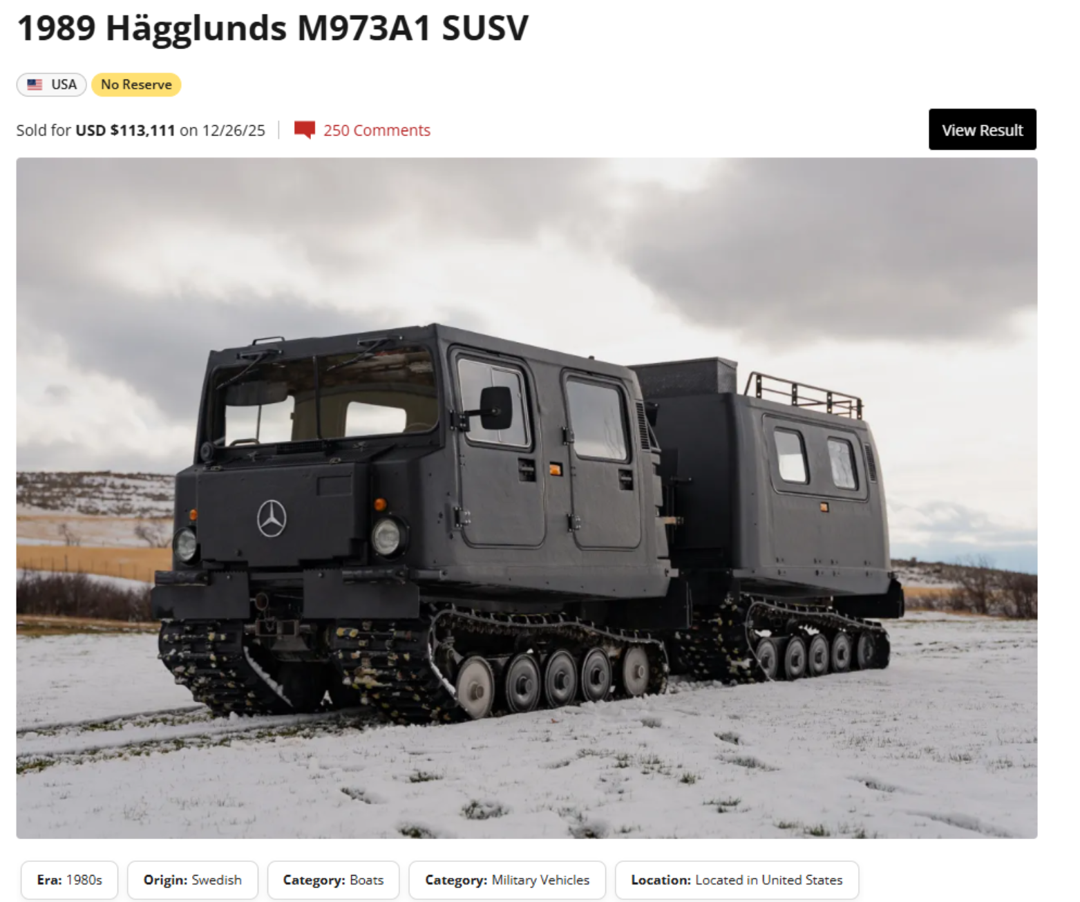 Bring a Trailer offers several auction categories. The most relevant to our readers are ATVs, RVs, campers, trucks, 4x4s, and vans. That said, they also auction aircraft, race cars, and boats, too. Occasionally, you’ll even find something completely unexpected, such as a tracked amphibious Hägglunds M973A1 Small Unit Support Vehicle (SUSV).